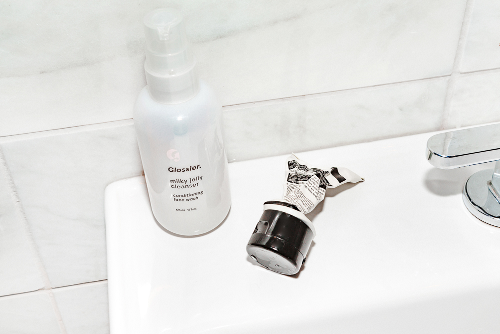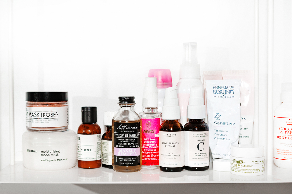 My skin is sensitive, so I'm careful about what cleansers I use. I love this Andalou Naturals 1000 Roses Cleansing Foam. I also use the Glossier Milky Jelly Cleanser, but I’ll change between the two depending how my skin is feeling. I like that the Milky Jelly removes my makeup and afterwards my face feels really clean and not dry. I also have an Aesop Purifying Facial Exfoliant Paste with lactic acid that I use after yoga or if I’ve been sweating. Then I’ll spray my face with Evian water, which makes it feel cleaner. I let it dry and I’ll put on either the Elizabeth Dehn for One Love Organics Brightening Facial Serum for day and then the Love Springs Eternal Youth Preservation Serum for night. I really like the idea of putting oils on because it makes me feel like I'm taking care of myself. I also like the consistency because it’s not too runny, it just holds nicely. I’ll do this AnneMarie Borlind Day Cream for Sensitive Skin and then add Kiehl’s Creamy Eye Treatment with Avocado, too. I would love to start doing things like masks but I feel I never have the time or the energy. I like the idea of using a rose clay mask but I mean… I’ll use it eventually.