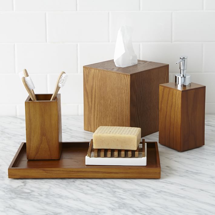 - New fixtures: The easiest way to redecorate simply and on the cheap is by switching out your core fixtures. Shop for the Magic Three: toothbrush holder, soap dish, canister. West Elm's wooden set is both perenially cool and fall festive. Also, an available canister stocked with cut cutton feels unbelieveably luxurious and is mad cheap to do. Make it polished teak, and your bathroom feels like Fallingwater.