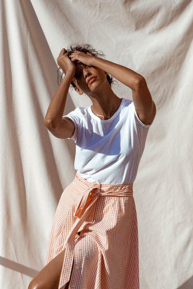 Cora wears a Gap tee and a Lisa Marie Fernandez skirt.