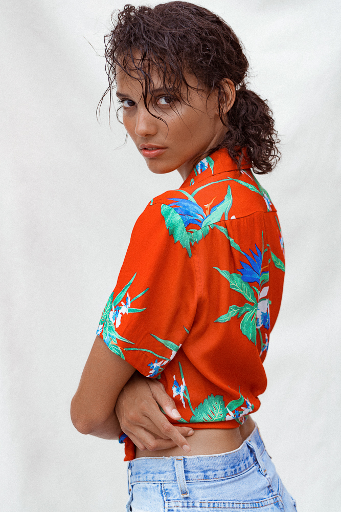 Cora wears a top and bottom by Matteau Swim and a polo by Frame.
