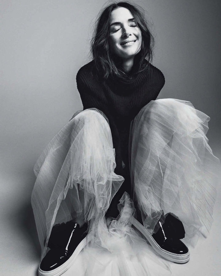 For the shoot, the only direction was that it was to be shot in black and white—and she was supposed to look like "Winona." So I kept it simple. I used Tigi Queen For A Day to blow out her hair and give it some texture. After that, I finished with a little Aveda Pure Abundance Hair Potion for fullness. For the wet look, we just used tap water. I didn't want her to leave with hair covered in gel or oil—again, clean and simple were the goals.
