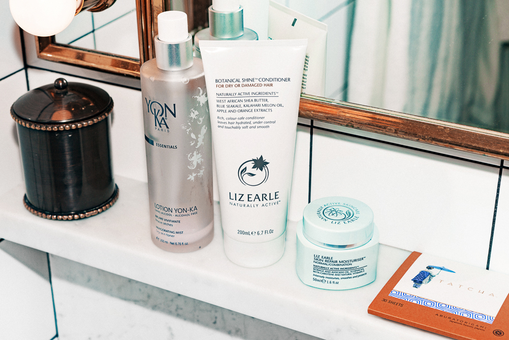I’m a really big fan of this company called Liz Earle. I get facials from her place in Leeds, where I'm from. My everyday routine starts at night in that I like to get all the makeup off my face, which is why that Liz Earle Cleanse and Polish thing is really good. And then you put the cloth in water, hot water, and then you wring. So it’s not wet anymore, it’s just hot, and then you just do little circles. It takes all the makeup off, and probably the top layer of your skin as well. [Laughs] And then I’ve got this mask that I sometimes use by a company, Yon-Ka. They sell it here in New York, but I think it’s French. I never see it at home, so I always get it when I’m here. And that’s like a crazy 1980s face mask, because you put it on and it’s like clear shiny slimy stuff, and then it kind of dries. And it looks like you’ve got cling film all over your face.