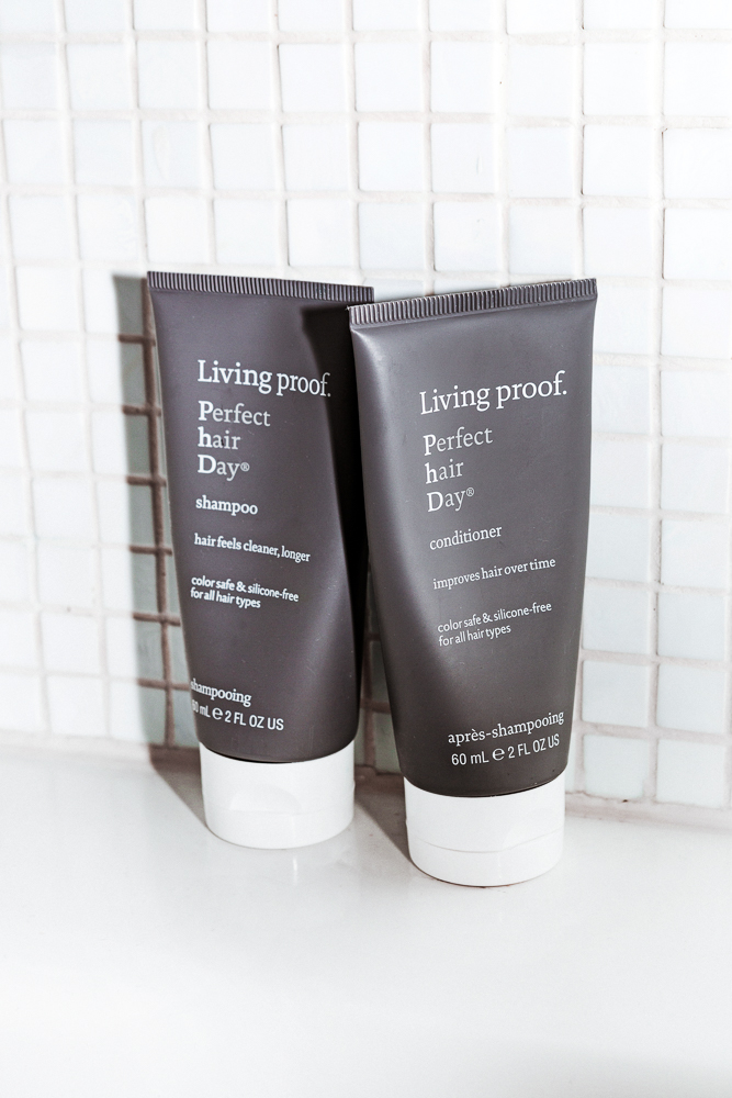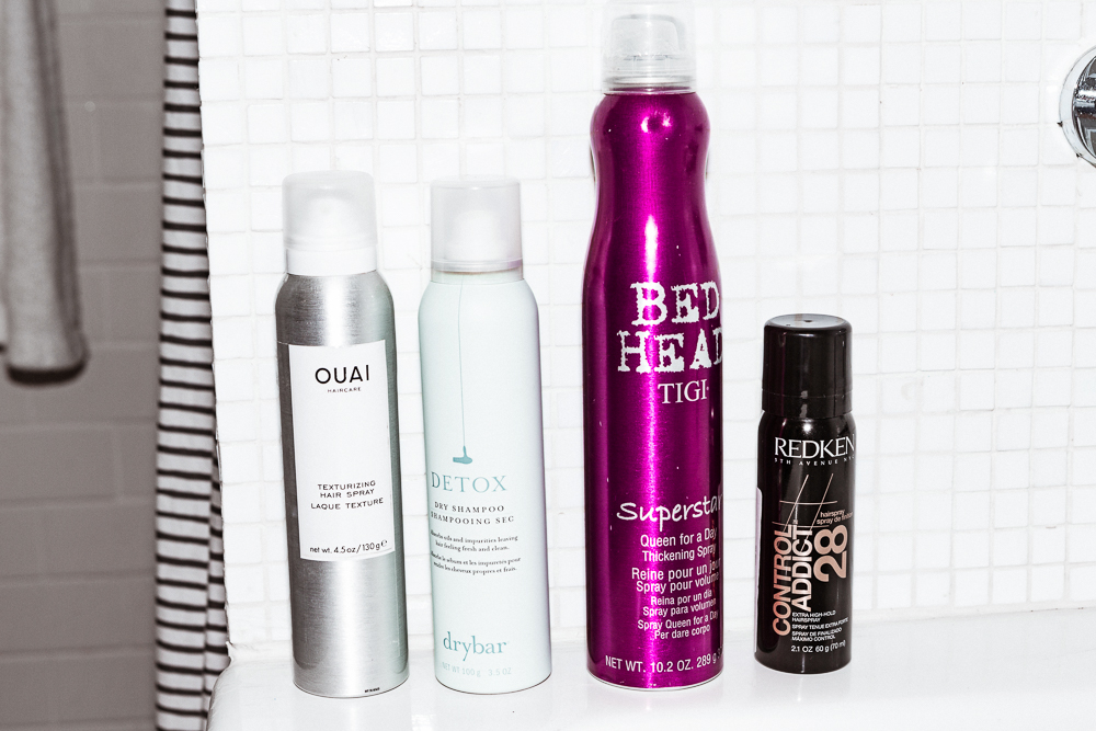 So I really don’t know how to do my hair at all. [Laughs] I always just end up putting it back into a bun. Everything I use is for texturizing—Tigi Superstar, which is a thickening spray that a lot of hairstylists use, and the Ouai Texturizing Hair Spray. Whatever will make it bigger. Recently I bought this Living Proof Perfect Hair Day Shampoo and it’s really good to use every day. Because that’s the other thing—I work out so much I want to wash my hair every day even though you’re not supposed to. I prefer the way dirtier hair looks anyway too, and the Perfect Hair Day line helps with that.