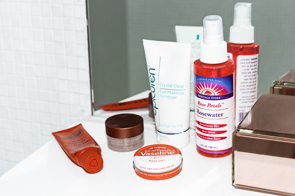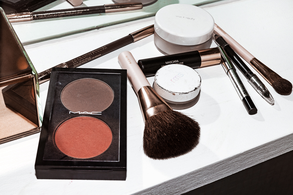 Day to day, I don’t wear much makeup. I will for events obviously, but I don’t even have that many products. I like to use one product in three different places—for example, I have this rose-colored Vaseline that I use on my lips and as blush. There was a time where I did wear a lot of makeup and I remember my friend asked, ‘Do you have dirt on your face?’ because I had put so much bronzer on it actually looked dirty. But now I have the MAC Taupe blush—it’s the same one Pat McGrath always uses—and it’s the perfect color. They don’t sell it on its own, so you have to buy the refill and fit it into a palette. I use it on my cheekbones and in the eye socket, and then the Vaseline as blush and then the RMS Living Luminizer or the Nars Orgasm Multiple. I think it just makes you look younger and fresher.