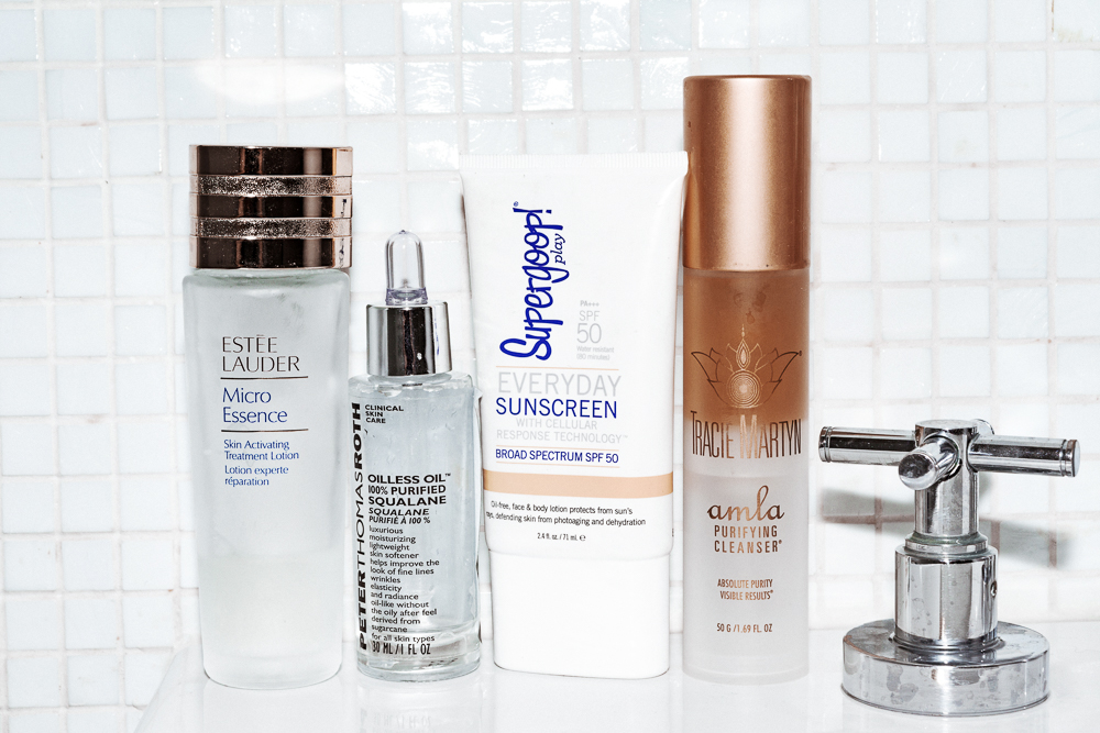 I never had any pimples growing up until I turned like 22, and I got really bad acne on my chin and jawline. So I saw all these dermatologists to see if I was allergic to something—apparently I have a very mild milk allergy and went on some antibiotics to clear it up. Now I’m all about skincare. When I wake up in the morning, I wash my face with Tracie Martyn Amla Purifying Cleanser, which gets you clean but is gentle enough for every day. I also exfoliate every day with the Tata Harper Smoothing Scrub. It’s not scratchy—it just feels like a good massage.