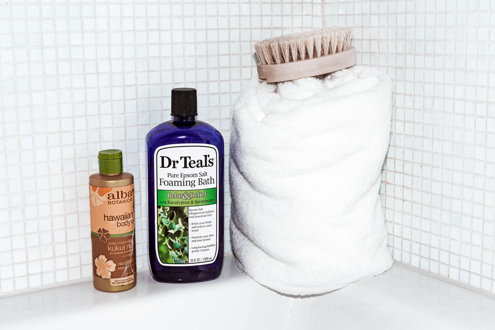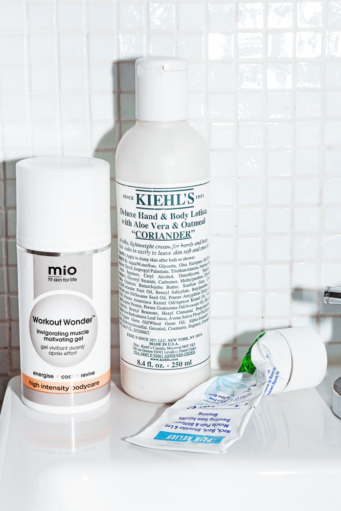 After I work out, I like to dry brush all the dead skin off my body. It makes me look amazing. If I’m sore, the Mio Skincare Workout Wonder Gel is really nice. It’s a really minty, fresh spearmint that’s supposed to increase circulation, decrease inflammation, relieve aches. Or else I have this Hawaiian Body Oil from Alba Botanica I use after dry brushing. That one smells good, but I’ve tried a few different brands and I’m always changing it up. And then I've been using Kiehl’s Coriander or Lavender shower gel for years now. I sweat a lot, so if I put on a heavy body butter it traps the heat in and it’s just unbearable. This is a really light breathable lotion that’s still moisturizing and nice.