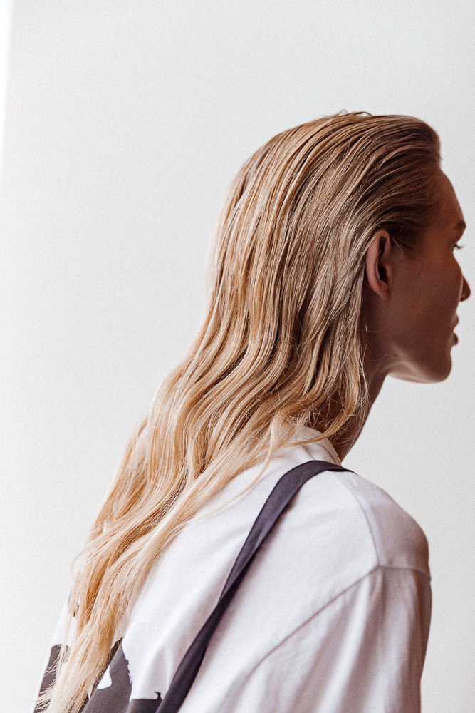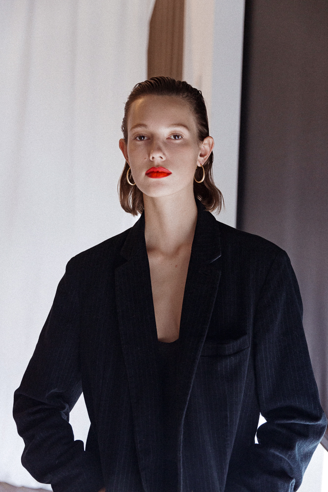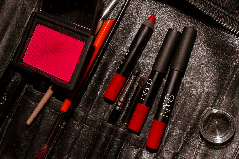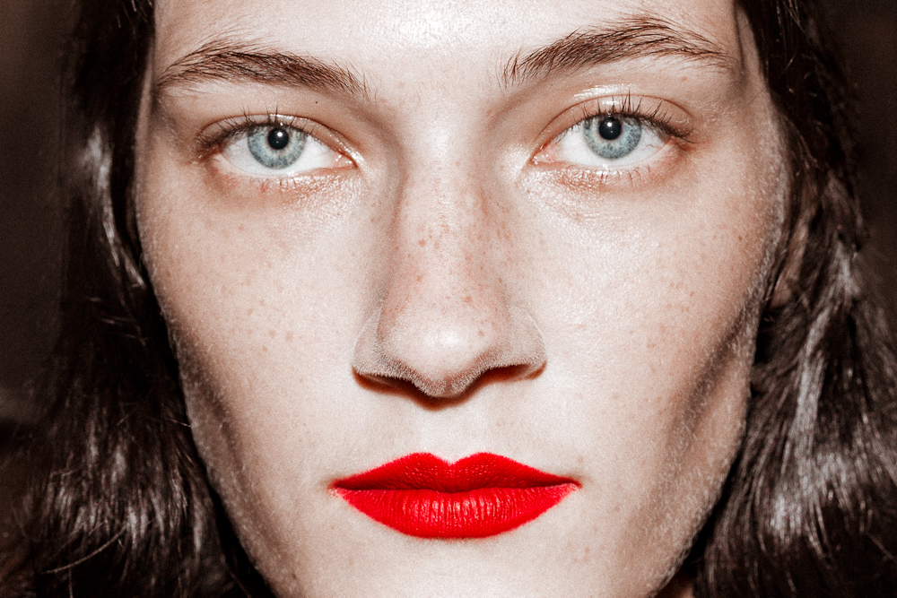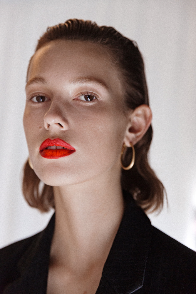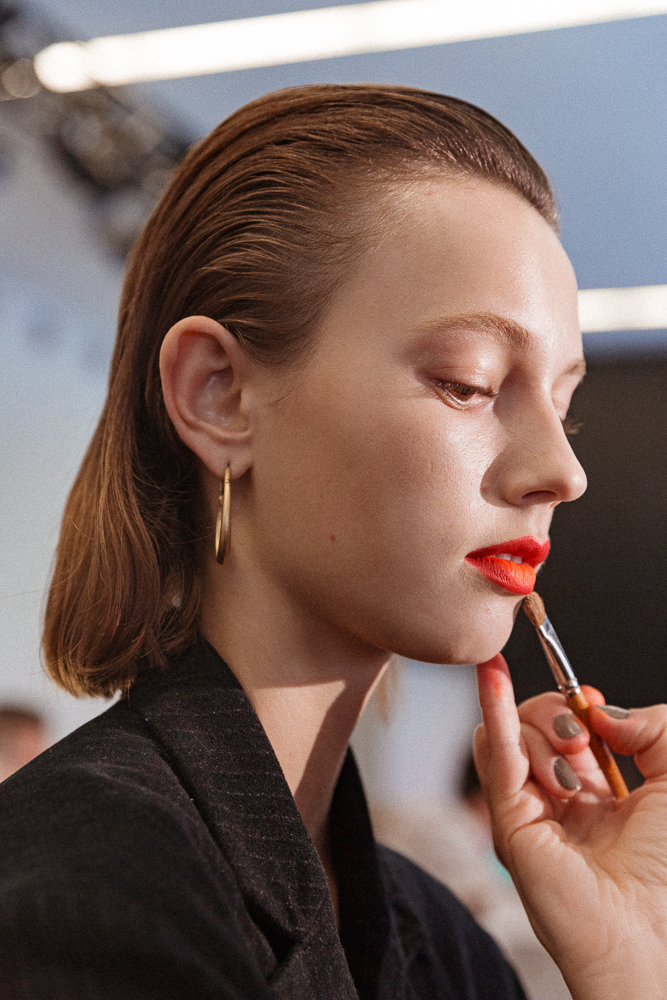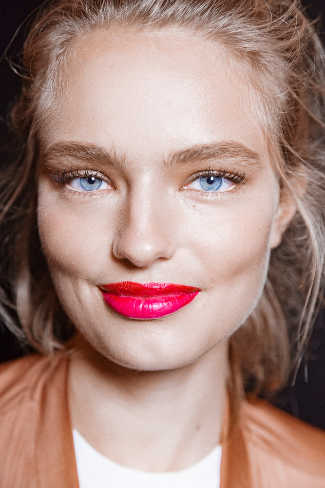 This is Yadim's take on red lips—precise and nuanced. The base is Maybelline Color Sensational Liquid Lip Color in Orange Shot, finished by tapping in the matte Orange Danger over top. Pairs well with some of the most wearable "wet" hair seen to date, care of Tresemmé Hair Gel, a heavy hand, and a paddle brush.