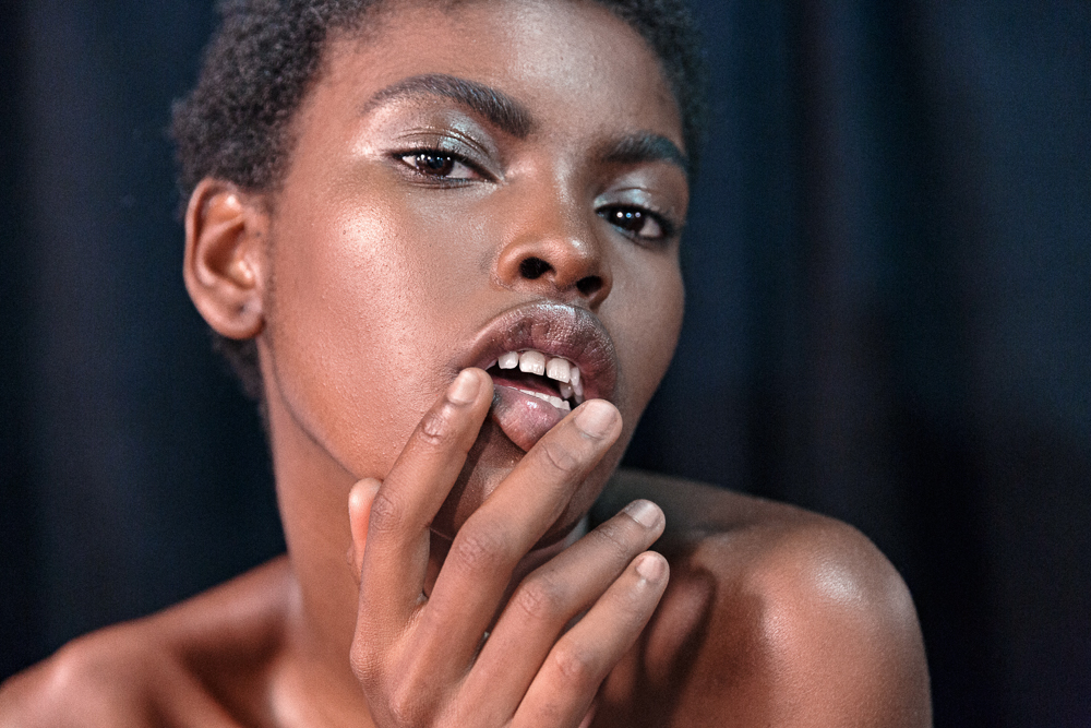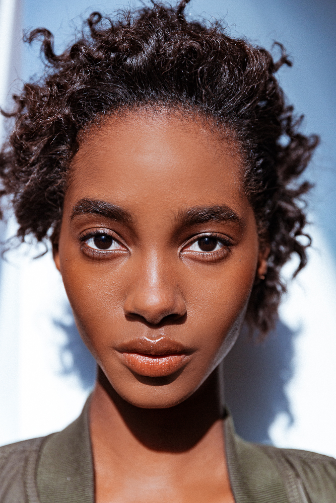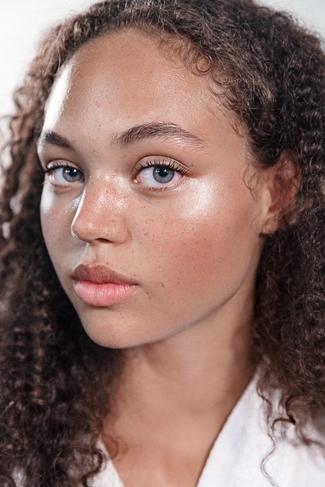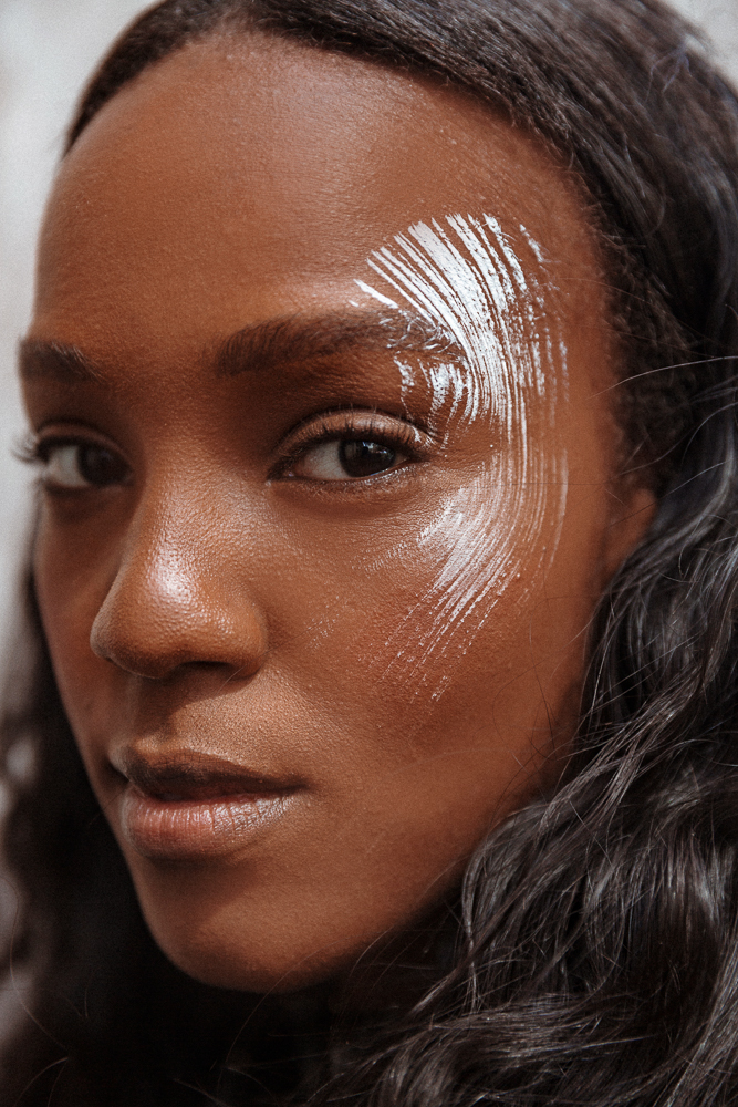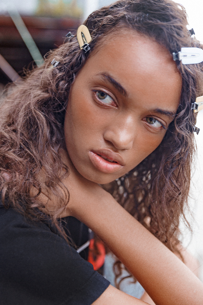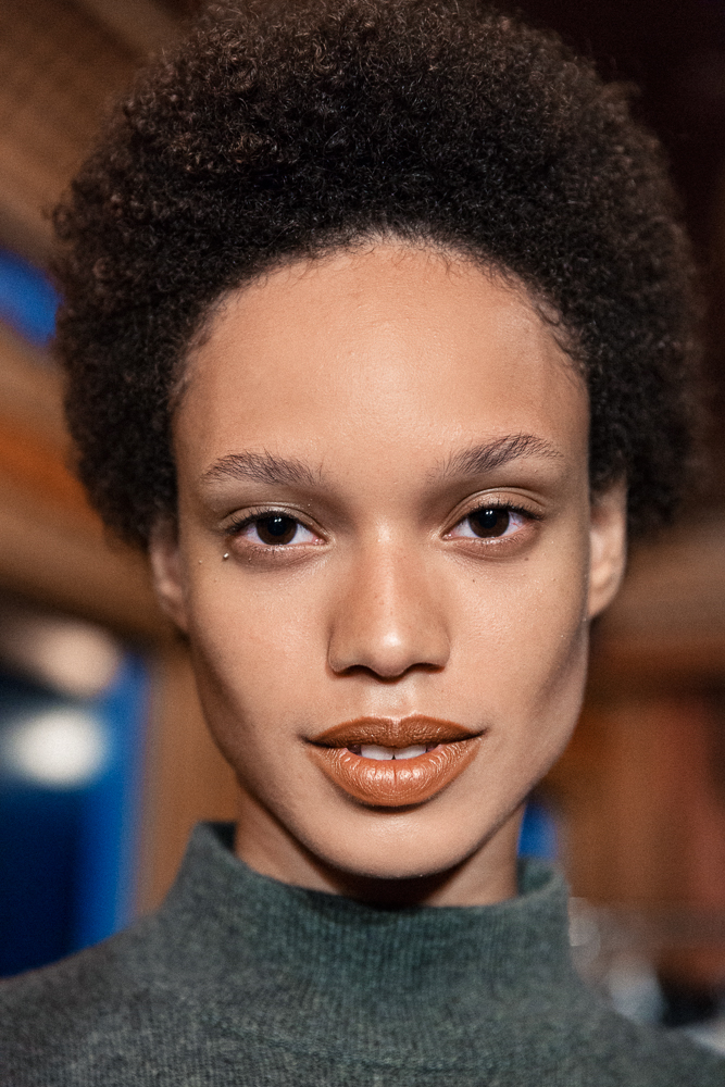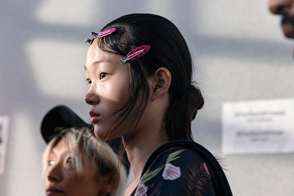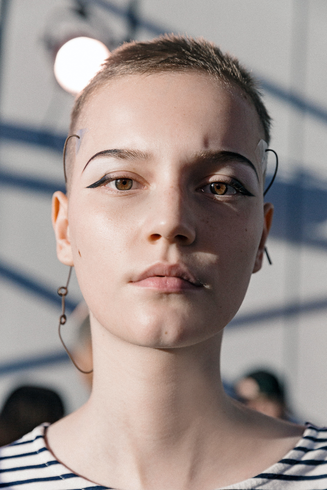 During show prep, Anthony Turner had each of the models wash their hair backstage—using either Bumble Gentle Shampoo or Curl Shampoo, depending on their natural texture. "All the little mistakes we get in the hair after it’s been freshly washed is what we’re enjoying." Also, painted ears.