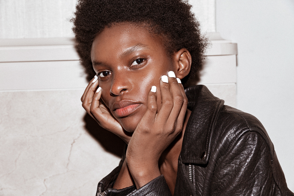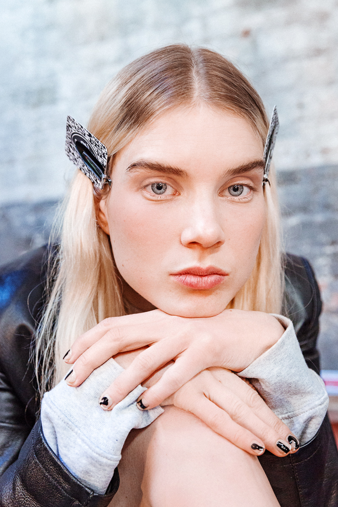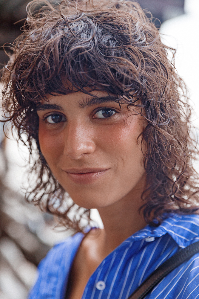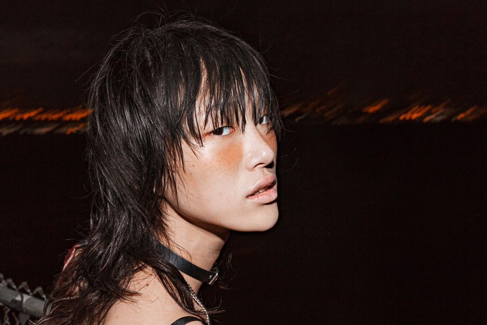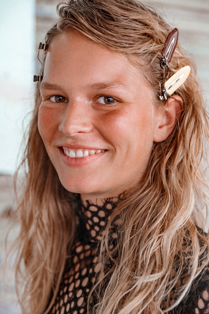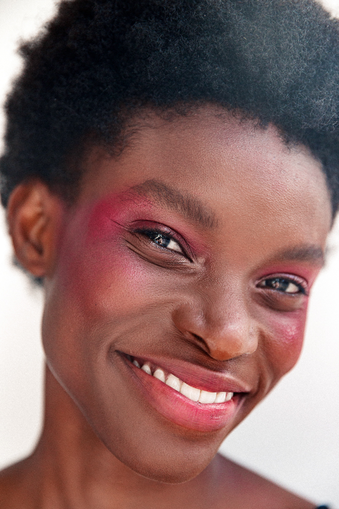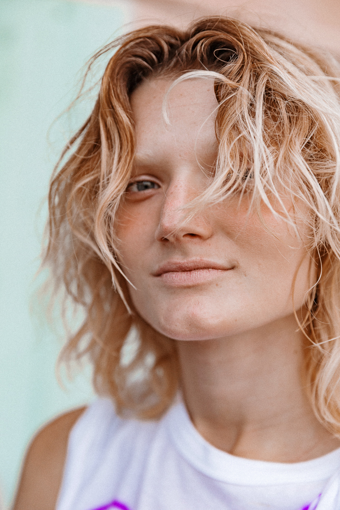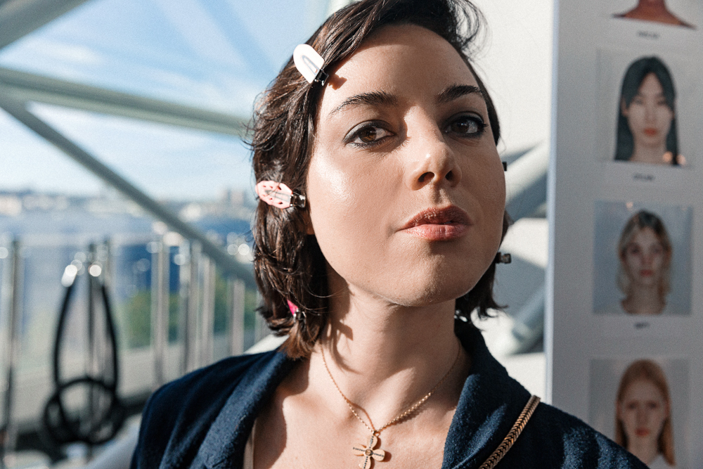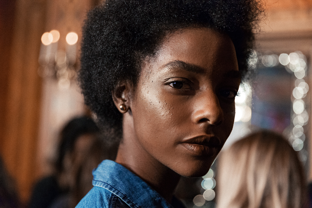 During show prep, Anthony Turner had each of the models wash their hair backstage—using either Bumble Gentle Shampoo or Curl Shampoo, depending on their natural texture. "All the little mistakes we get in the hair after it’s been freshly washed is what we’re enjoying." Also, painted ears.