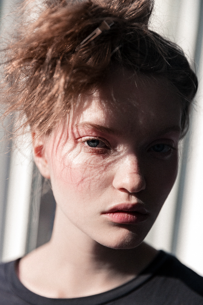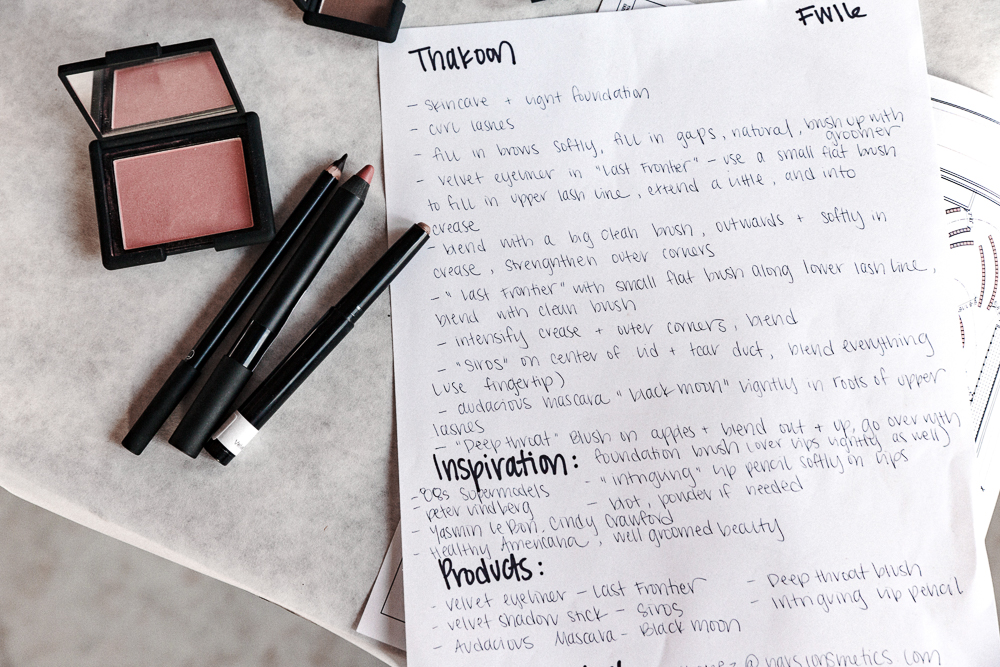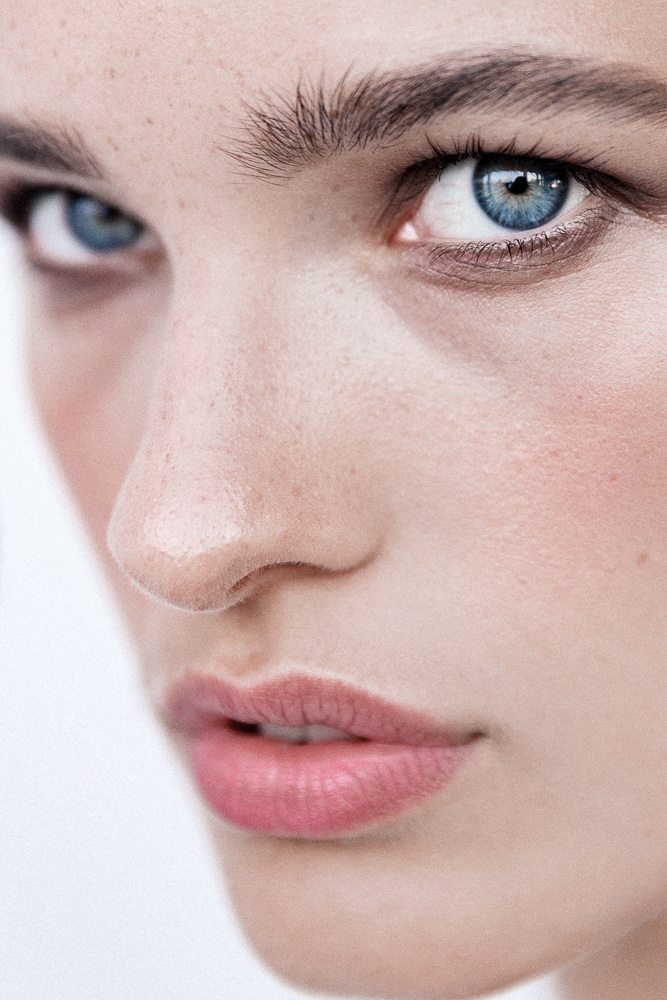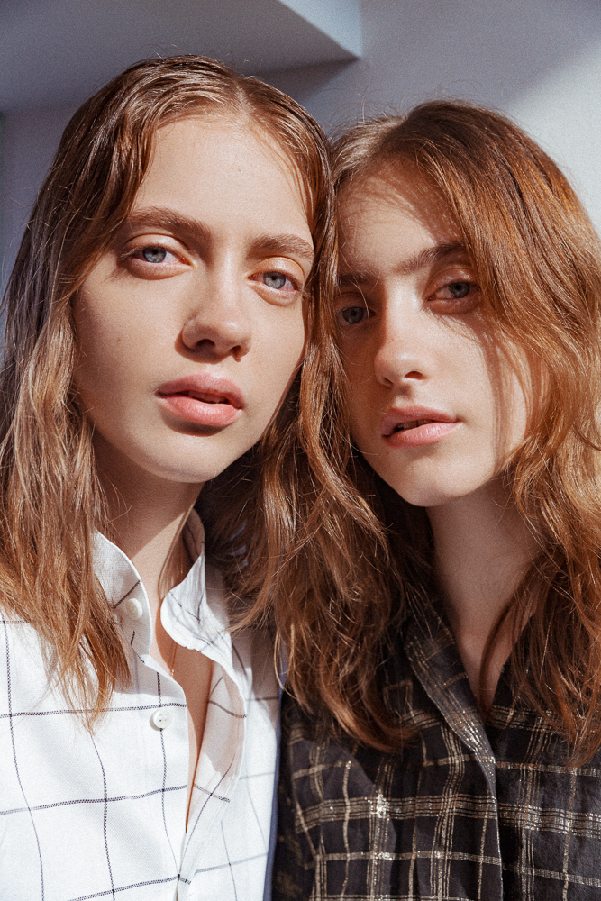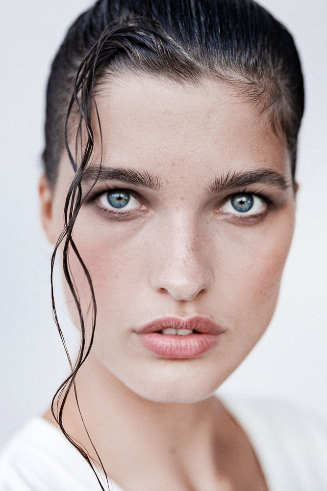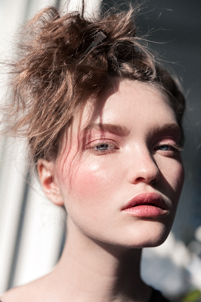 American beauties by Diane Kendal and Odile Gilbert. Big brows (Nars Matte Eyeshadow plus Brow Gel), flushed cheeks (Deep Throat), and stained lips (a forthcoming Matte Lip Pencil that looks a lot like Sex Machine. The hair was inspired by American fashion magazine covers, the end result being a wet chignon we're not going to attempt at home, but that looks amazing here.