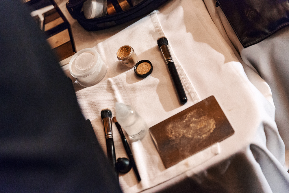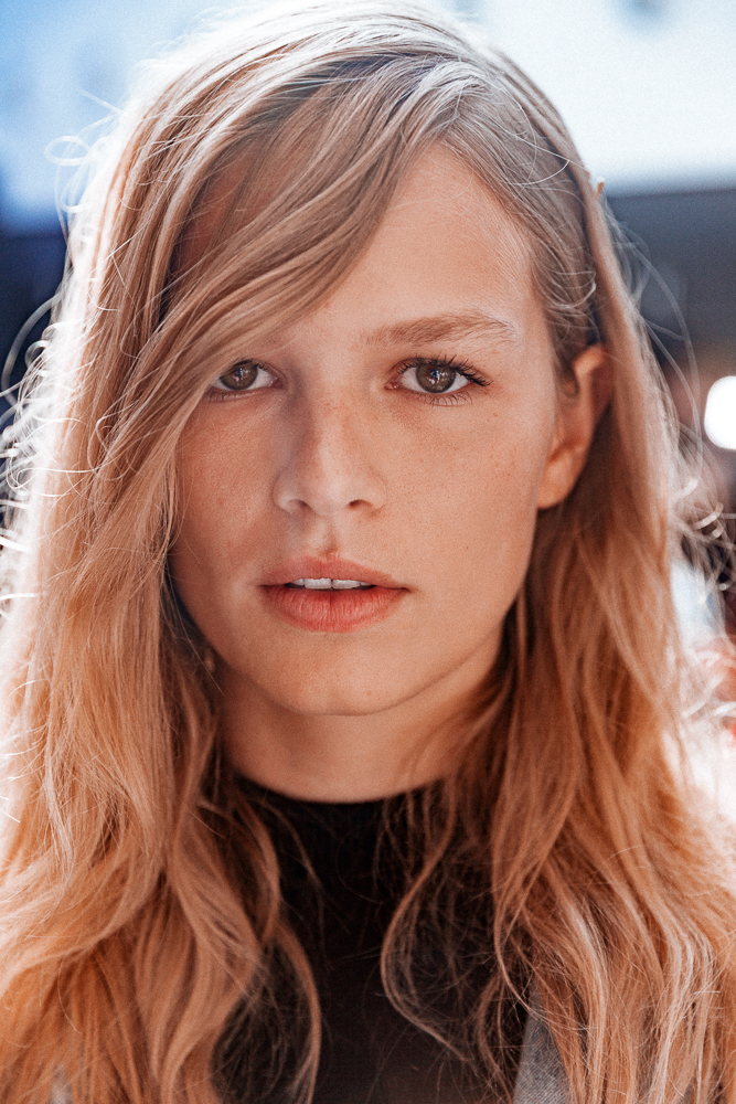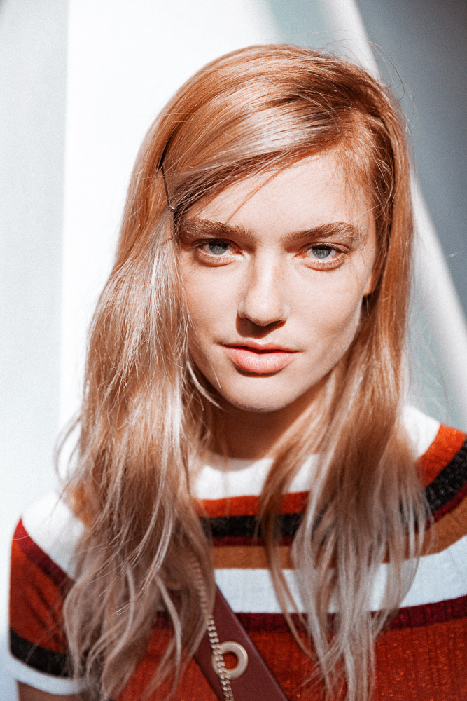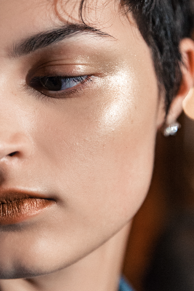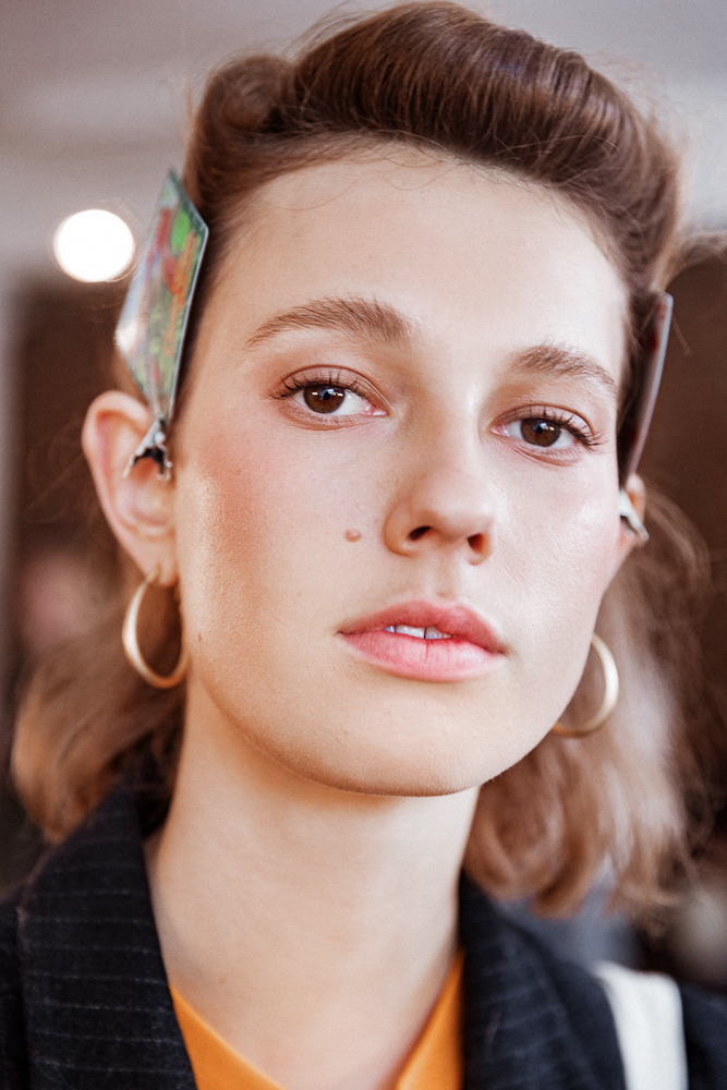 Less glow, more gold. The hero product in Tom Pecheux's kit was a MAC Gold Pigment, which he applied generously to the models lips (after prepping with a deep concealer from MAC's Spring 2017 palette) and also to the cheeks. The hair was—surprise!—individual for each girl, a not-too-perfect take on party hair care of James Pecis.