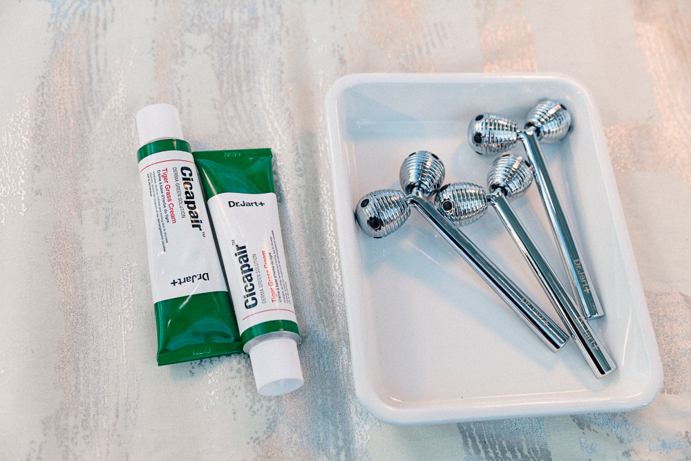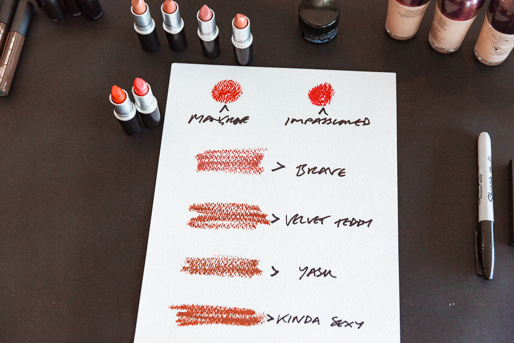 Another red lip moment, this time dual-toned (a look we love) and inspired by Michelle Pfeiffer in Scarface. The top lip is cherry matte in Perfect Score, the bottom is a matte pink in Relentlessly Red, and the blush was a combination of the two shades. Balance is everything.