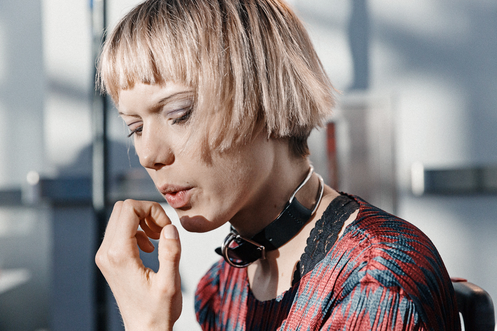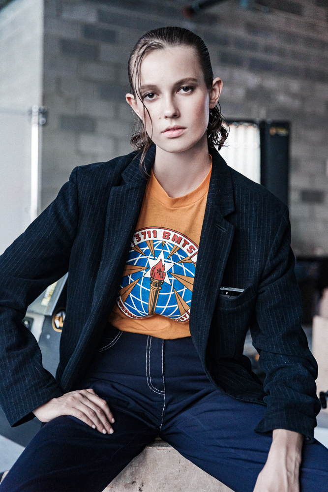 Bedhead, prepped with Bb Surf Spray and pulled into a low bun, and a red lip, courtesy of Nars Dragon Girl with Exhibit A pressed on top. An undone look you can believe in, thanks to Holli Smith and Mark Carrasquillo.
