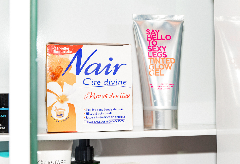 When I was growing up, I was taught never to shave. My mom would be pissed if I shaved! So I’ve been waxing since I was 14. In Paris, it costs me only $12 at the salon, but here it’s $50, so I started to do it myself. I use Nair Cire Divine that I bring back from France, but you can get it on eBay too. I warm it up in the microwave and you just apply it, it dries, and you take it off. This one is great because it’s not painful—and a lot of them don’t work but this one really does. Takes time but then you’re hair-free for like three weeks.
