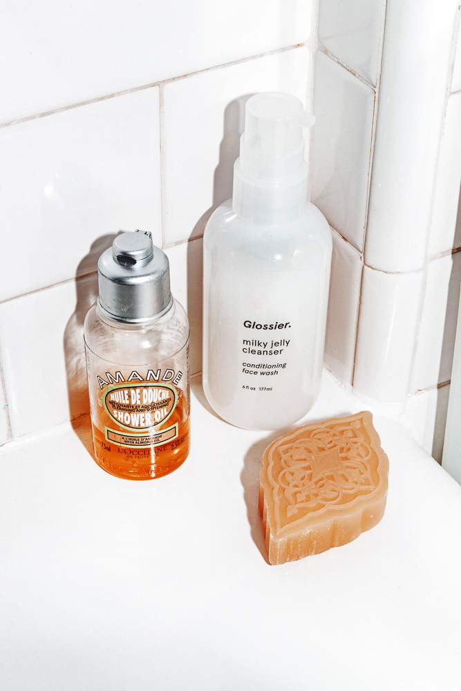 In the shower my favorite soap is the Hammam Soap from Senteurs d’Orient. I have the jasmine one. It foams really well and whenever I enter my bathroom it smells like a garden in Lebanon in the middle of NYC. Then, I have a lot of body lotions. If I want something lightweight, I used the Johnson and Johnson Baby Lotion—it sinks right in. Otherwise I use the La Roche-Posay Lipikar Milk—it works well enough for winter while still being light enough for summer. Otherwise when I’m super super dry, I love the Vichy balm–it’s fantastic. Very thick but it melts in. And it smells really yummy.