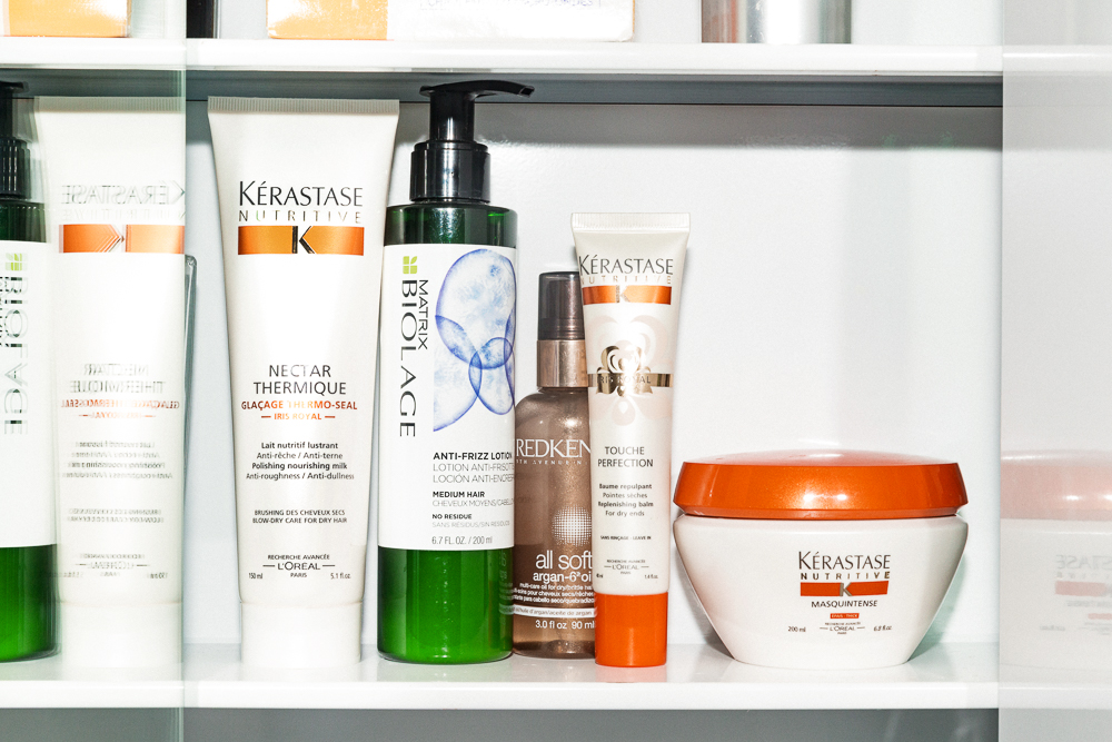For shampoo I like to switch from one wash to another because I’m scared my hair will get used to one and it will be less effective—I’m sure this is nonsense, but whatever. I use the Garnier Whole Blends Honey Treasure when I need to clean all the product buildup out. It smells amazing—and the smell lasts for days—and gets the job done. Clean hair, but not too squeaky clean. For days when I feel like I need more nurturing, I use Kérastase Bain Stain 2, which honestly makes your hair so soft. When I’m traveling, I like Matrix Biolage Cleansing Conditioner because it acts like a shampoo and conditioner at once if you lather it for a few minutes. I’ll also use it as a leave-in sometimes.