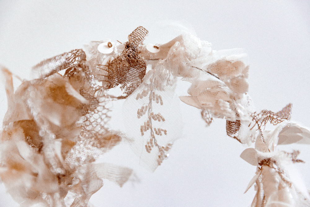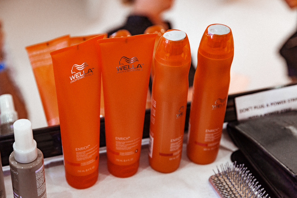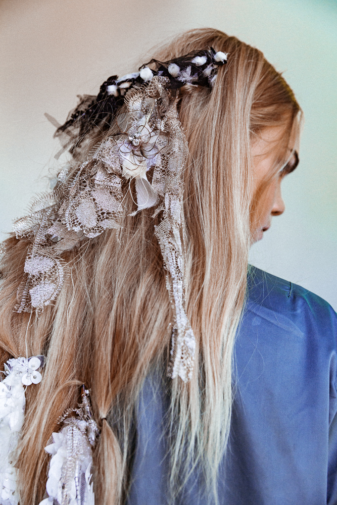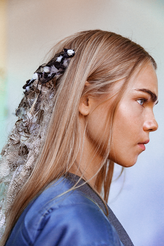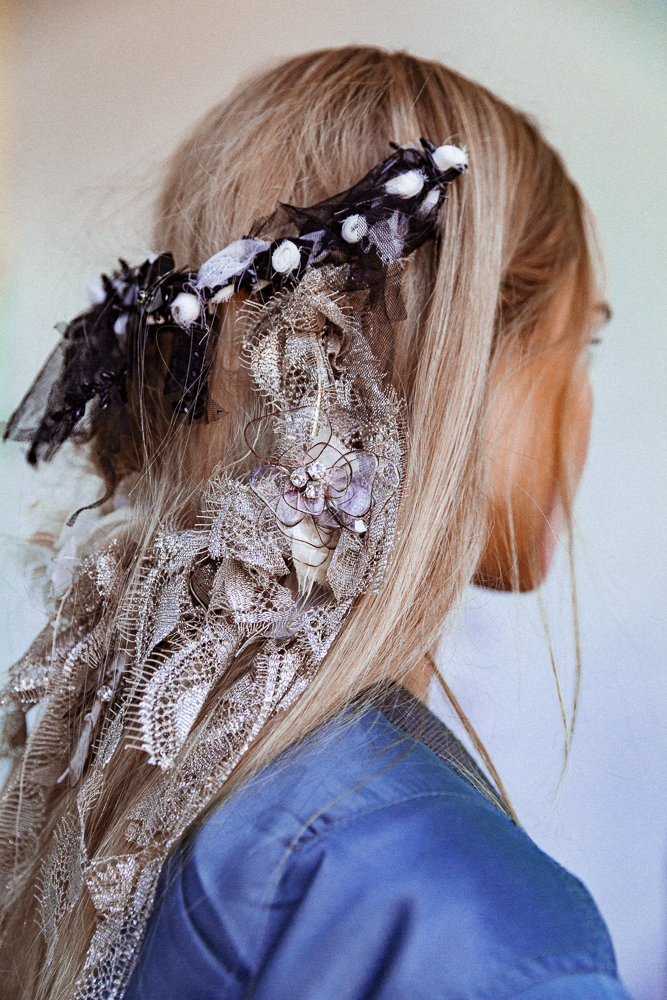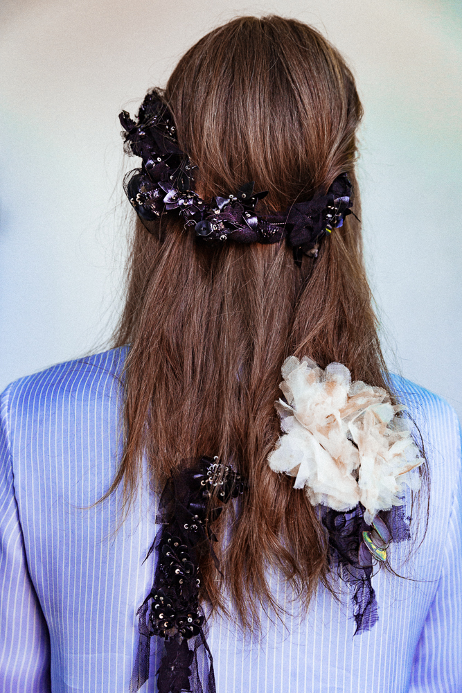 Odile Gilbert for Wella kept the hair clean and natural to start, but laced ribbons and barrettes that her team created using textures from the collection throughout. The inspiration, she explained, was youth again, but literally this time. "It's as if you're a kid in school, and you're supposed to create something instead of buying something." She explained. "It’s very important to not to think and just to do. You grab some hair, and you cut a piece of fabric, you just do a knot, and you make it look a little rough."
