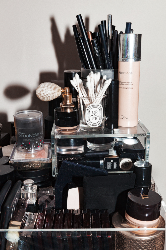 The best thing ever is Kevyn Aucoin’s Sensual Skin Enhancer. Half the time I’ll take a little dab and mix it with moisturizer. That’s all it takes, so one pot lasts forever—I’ve had mine for a year. For heavier coverage, I’ll use the Charlotte Tilbury Magic Foundation with a Beautyblender for an airbrushed look. There’s nothing quite like it, to be honest. In terms of concealer, I like Kat Von D’s Lock-It Concealer and I like the Nars Radiant Creamy Concealer. The Nars is good because it’s not heavy-duty but it has a nice finish. After that, I do powder 'cause I’m oily as hell. I'll either use Bare Minerals Mineral Veil or Diorskin Nude Air Powder in Medium Beige. Then for blushes I typically like a peachy-apricot kind of look. Clinique Cheek Pop in Ginger Pop is my all-time favorite. For bronzer, I switch between Nars’ Casino and Valley. I apply it underneath my cheekbones and around my forehead.