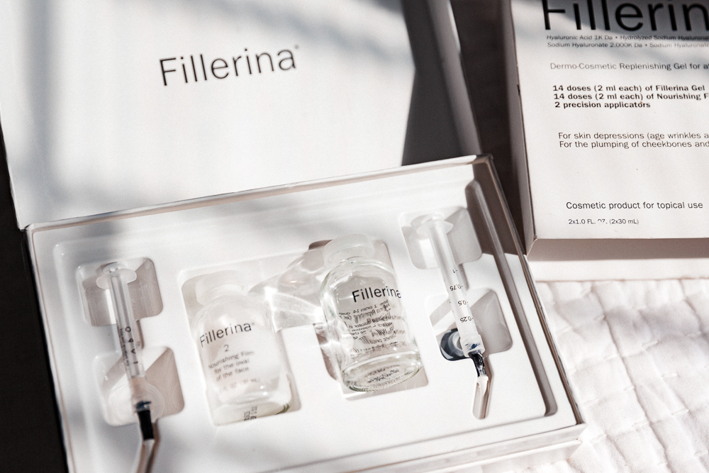 Lately I’ve been using the Fillerina, which is a hyaluronic acid that’s apparently just as good as fillers. It has a patent in Switzerland and just came over to the U.S. It looks like a syringe, but it’s just a topical—I put it around my nasolabial folds because my dad has really deep smile lines and I don’t want to get them. And then I’ll pat the excess on my forehead to prevent lines there. Then I’ll use the SK-II Facial Treatment Oil after that. That’s been my routine as of late. The oil will cover my lips so I don’t need a balm or anything. And I’m over eye cream—it’s just another step and I’ve got plenty of steps already.