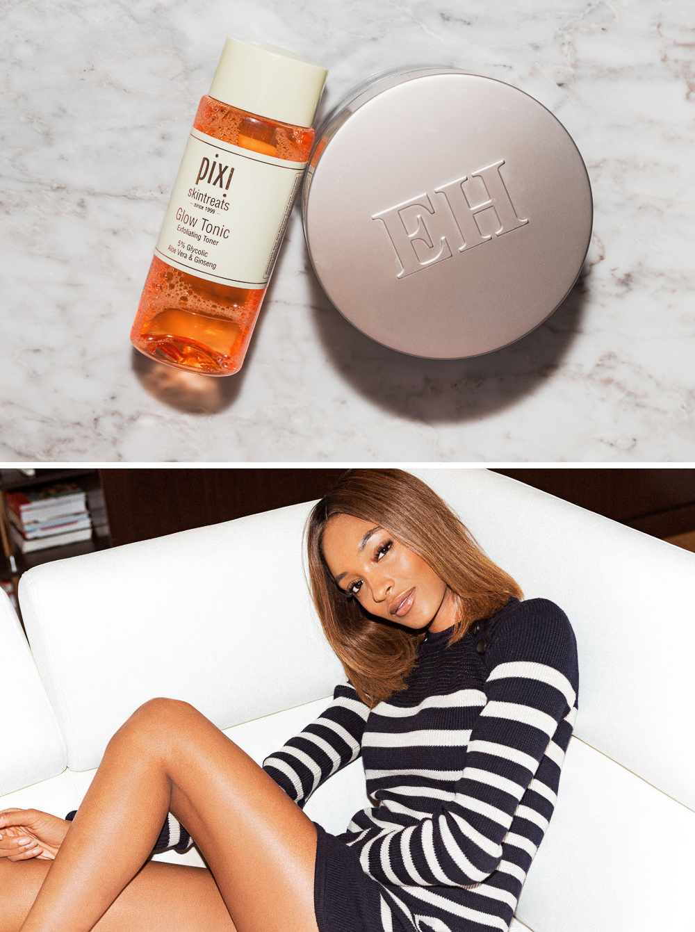 Jourdan Dunn's cleanser of choice is Emma Hardie's Moringa Cleansing Balm which, oh my God, is one of the best things I have ever used on my face. The product is very oily and conditioning, and it is the nicest smelling cleanser in this roundup. Despite being a oil-rich cleanser (grapeseed and almond for moisture; neroli and orange for brightening and rejuvenating), my face feels perfectly clean afterwards. Jourdan sometimes switches this out with coconut oil, which I will not do. Jourdan! Girl. Hold your Emma Hardie balm close and never let it go. Afterwards she uses Pixi Glow Tonic, an exfoliating toner with glycolic. "I'm hooked!" She says. Me too. My skin looks better than when I started, and I've only just begun.