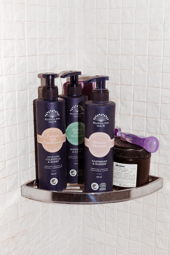 My shampoo and conditioner is the best ever. I use Rudolph Care Blossom Shampoo and Conditioner with rosehip and raspberry. It's the way it cleanses my hair without being too... you know. A lot of hair products are so smelly, but the scent of this is so light. And I can use the conditioner like a mask. If my hair is dry, I just put in a lot, but it doesn't get too heavy. When I go out, I'll just use classic Elnett. Even though it kind of smells."