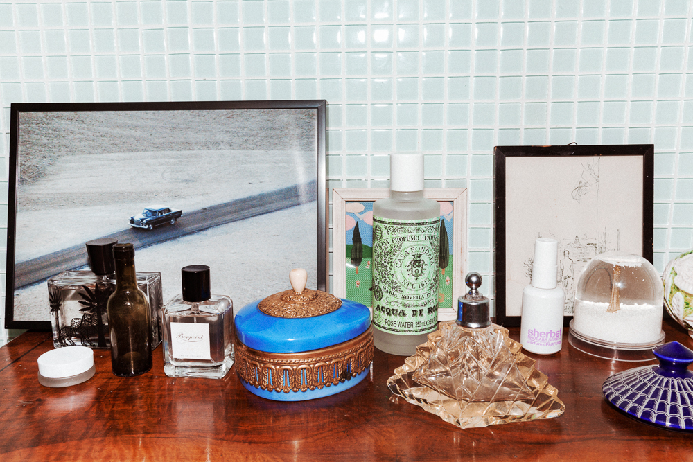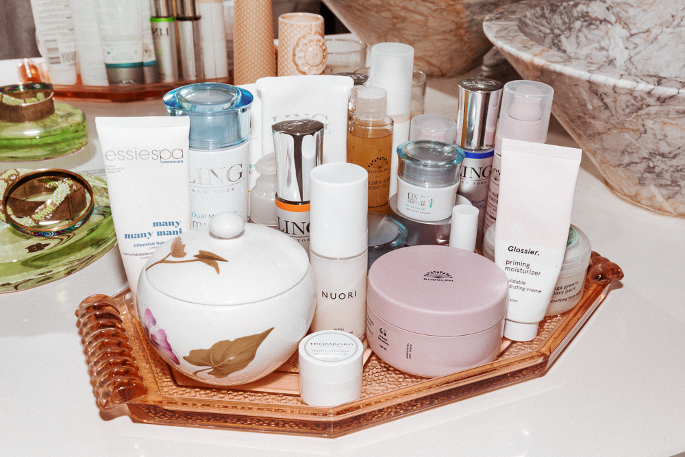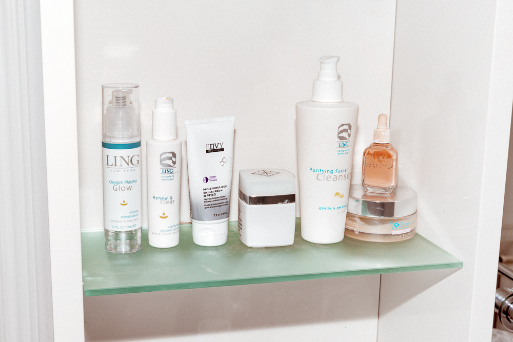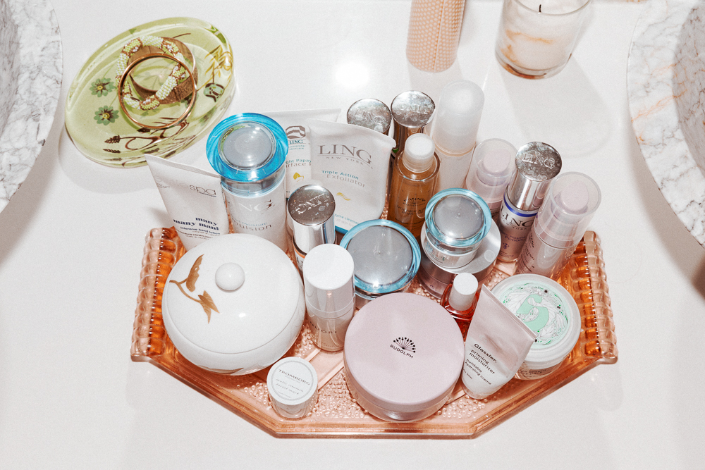 I’m taking very good care of my skin, too. I'm a sucker for products, which you can probably tell from all of the stuff I have. But it's all stuff that works—I like to use things that I can see working. Right now I'm using a lot of products from Ling. I was buying all of these different things, and I got a little eczema, and my doctor told me to stick to one brand. My routine is simple... cleanser, serum, day cream, sunscreen. I use the Ling Purifying Facial Cleanser because it's really light, and then I use their Hi-Vitamin C 12% or the Oxygen Plasma Glow. Sometimes though, if I'm really dry, I mix it up with a Rudolph Skincare Oil. My sunscreen is Lumixyl Moisturelock Sunscreen. I also use Ling Eye Cream, but that's a little boring. [Laughs]