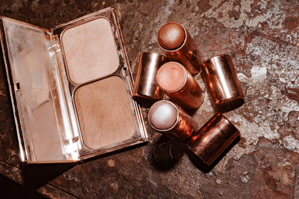 Then for cheeks, I use this Givenchy Hydra Sparkling Magic Lip and Cheek Balm—just on the cheekbones and the bridge of my nose. I love it! If it comes on too pink—which it can–I mix it with Charlotte Tilbury's Beach Stick in Ibiza. If I use this Charlotte Tilbury Bronze and Glow, my friends will be like, 'What the fuck is on your face?' The sculpt side I don't really use, it's mostly good for red carpet, but I love the highlighter. If that's not enough, I'll use this Rosie for Autograph Starstuck Stick. It's a bit more iridescent, and just a little heavier. I'll put that on my nose and the upper cheekbone. To finish, I like to spray the Glossier Soothing Face Mist to set my makeup.