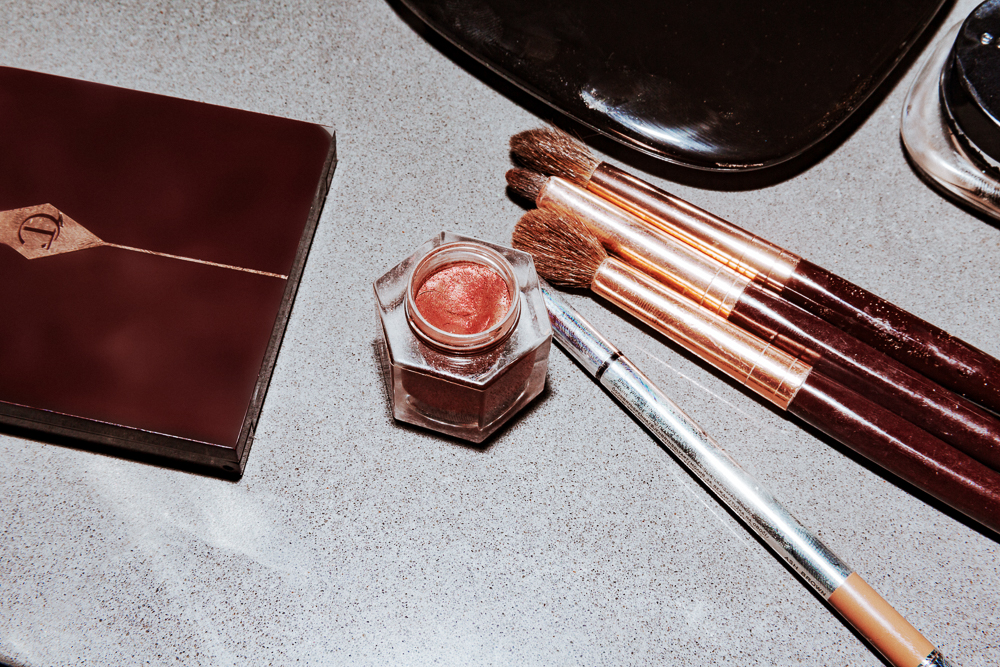 I don't always wear foundation, but tonight I wanted to do it up a little bit, so I'm using Charlotte Tilbury's Magic Foundation in 6 Medium. Then I tweeze my brows if I have any strays and brush them up with either Glossier Boy Brow or this Eyeko Brow Gel. It makes a really bushy brow—the brush really fans everything out in a way that I love. If I need to fill in any spots I use Marc Jacobs Brow Wow Defining Pencil in Ash Brown. Then I start on my eyes. Usually I'll grab this Charlotte Tilbury Luxury Eye Palette in Dolce Vita, which I'm in love with. You can see how much I love it! I use the rosy highlighter shade on the lid and then I do the red all around, and I blend in the crease with a Charlotte Tilbury blending brush.