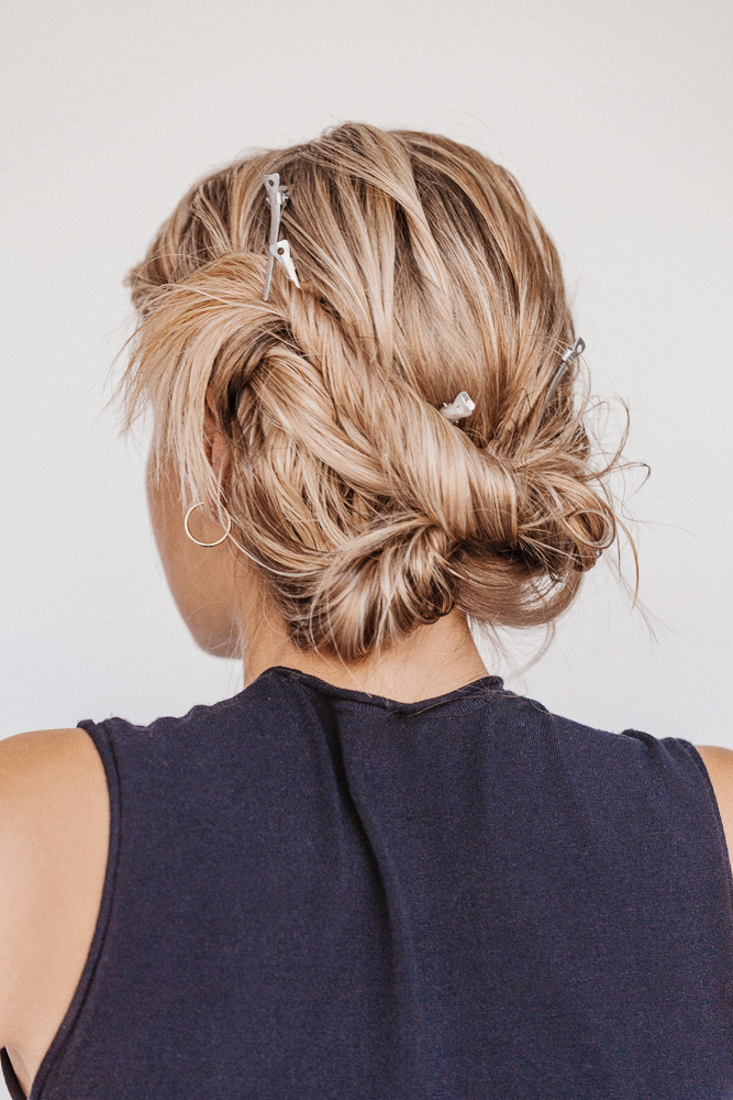 Strategically clip the hair back and forth from root to tip, section by section. You can tell how much hair to take in to the section by how easily the clips stays put. If the clip is sliding out, there isn't enough hair and if the clip seems to be squeezing the hair—like it would leave a mark—then you've taken too much.