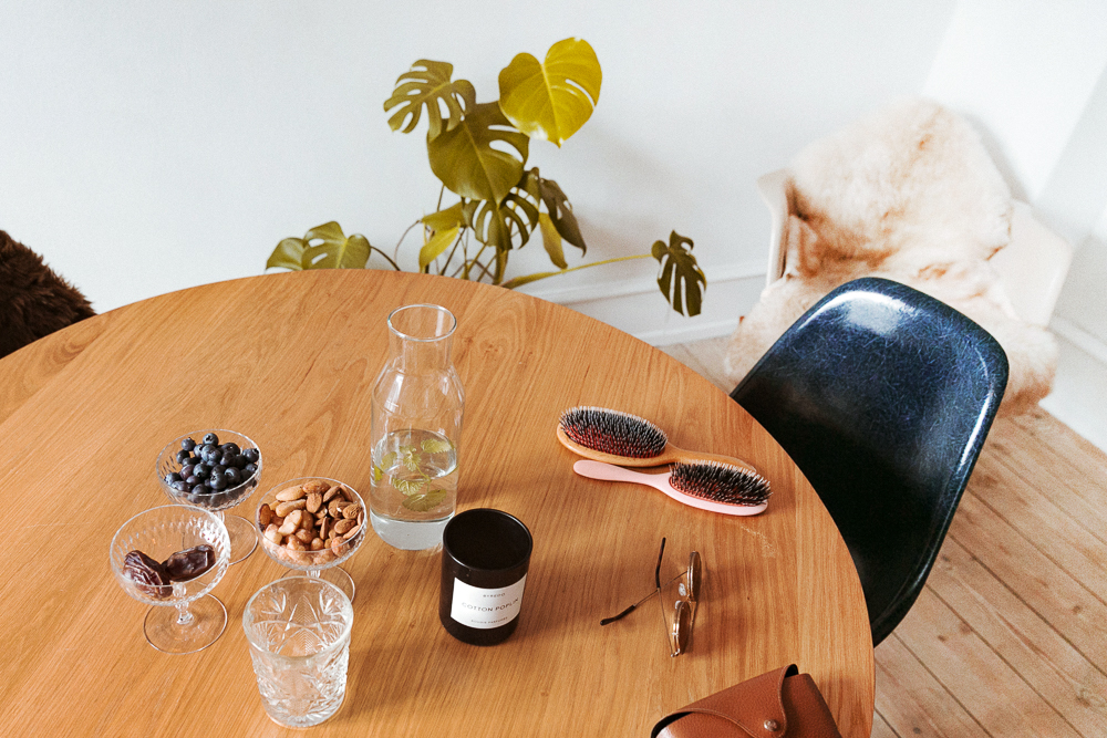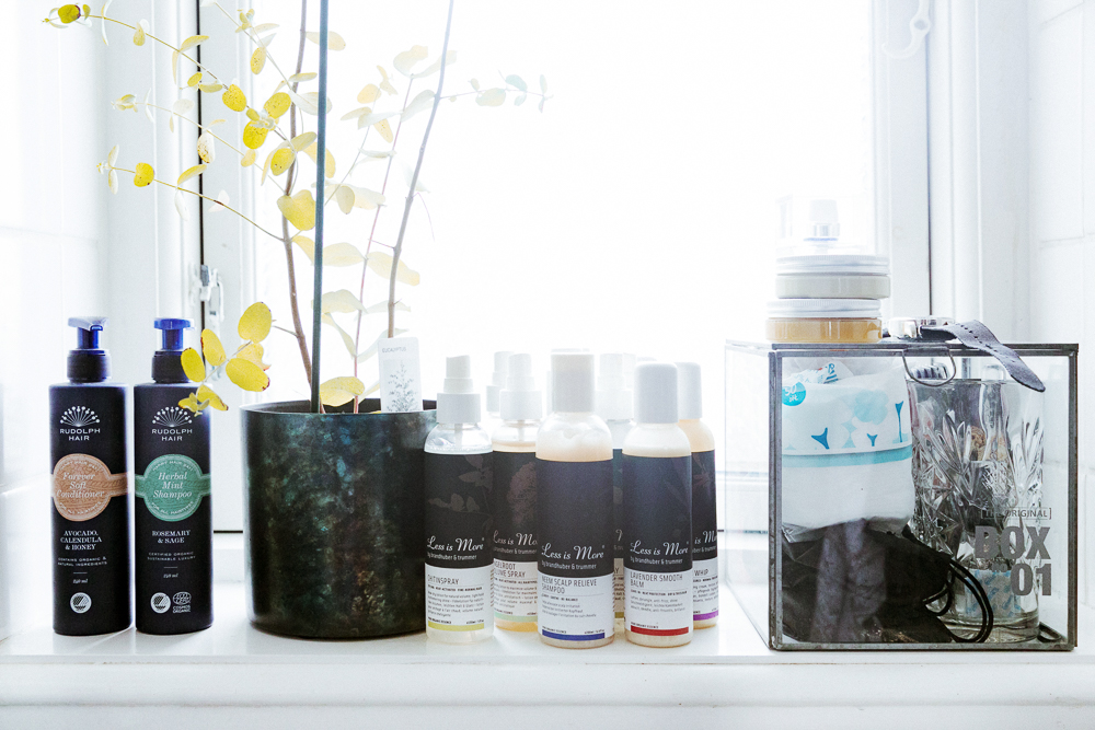 Of course, being a hairstylist, I am particular about my hair... but I really like it to look natural in that Scandinavian way. Which is actually one of the hardest things to do! I brush it a lot, and I don't use much product in it. I wash it in the shower once, sometimes twice a week, although I'll only do that if I've been around people smoking or whatever. Clean hair feels nice but it looks better dirty, that's the thing. I use my friend's line of products, Rudolph Hair, which are super nice. The products are not 100% green or 100% organic, but that actually makes them better for my hair because it needs some extra help. It's blond and there's so much of it, so I need a strong conditioner and a good soft shampoo.