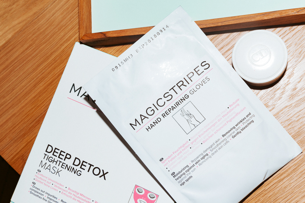I don't use hair masks, but I do love a hand mask. I'll use these Magicstripes Hand Repair Gloves instead of nail polish. They really work, but you can't use your hands for like 40 minutes to an hour afterward. Then I'll use the Christian Dior Cuticle Cream. That one I keep in my bag as well, just to keep my nails natural and beautiful. There's always a little rinse-free handwash in my bag too, because when you have your hands in models' faces all day long, it's good to keep your hands clean. For the rest of my body I like the Rudolph Care Açai Body Balm. It's amazing.