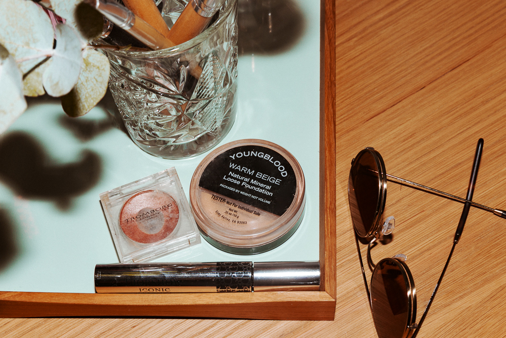 My foundation is Youngblood, which is nice but really pigmented so you have to be bit careful because you can't stick put your brush right in it, you have to be soft. Then I use this Tromborg Creamy Blush in a shade called Misty Brown––I don't use a brush, just my finger. That's a Danish brand as well. I've been using Diorshow Iconic Overcurl Mascara in Black for years, it's nice. I like that mascara helps open your eyes a bit so you look fresher. Although sometimes I kind of like that nude, bare eyelash look as well. And I always have my brow brush with me, because I have a lot of brows! [Laughs]