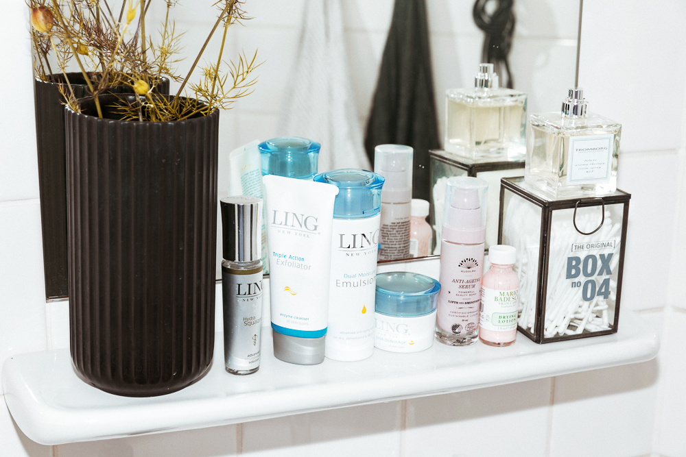 Like my hair, I try to use a minimal amount of products when it comes to my skin. I like when my face looks a tiny bit oily, but my skin can't handle too many oils, so I have to be careful. When I first got pregnant I would get some hormonal spots and whatever, and my dermatologist recommended this brand, Ling. I love their Triple Action Exfoliator––it smells so, so good. And it's helped my skin a lot! It's really gentle, which is good because I can't just use any scrub, my skin is too sensitive. I use that once a week and for everyday I just use Bioderma to wash my face. Afterward, I like the Dual Moisture Emulsion from Ling––it's like pure moisture, almost water, but it soaks in really quick. And then straight after that I'll use the Nourishment Cream, or at night I use a Hydra Squalane Advanced Nourishment Serum. My skin is super nice in the morning whenever I use that.