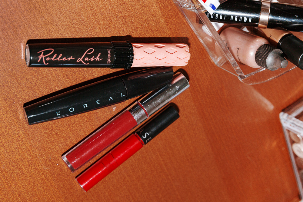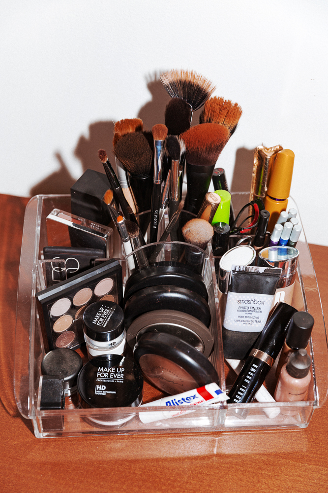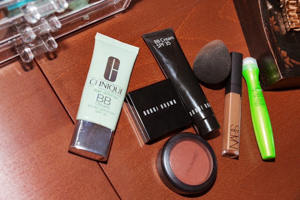The rest of my daily makeup routine starts with Clinique Age Defense BB Cream in 4, which I just started using when I realized it was the perfect shade for my skin right now. In the summer, I switch to Bobbi Brown BB Cream in Deep. Then I use MAC Blush in Raizin. That one has lasted me for years—whenever I use it, it looks like I’m contoured really well. I have this Nars Radiant Creamy Concealer in Almond, and then the Maybelline Eyeliner Stiletto. MAC Fluidline in Blacktrack is something I'll use with this angled brush, but it takes forever, so it’s only for special occasions. And I love fake eyelashes, I’m wearing them now. One of my girlfriends has extensions, but I’m not sure about those. The only time the fake lashes are embarrassing is when you don’t get the glue right. But it’s pretty easy and only $3. My mascara is either Rollerlash by Benefit or something by Maybelline. I also have Tarte Lights, Camera, Flashes—I switch them around a lot.