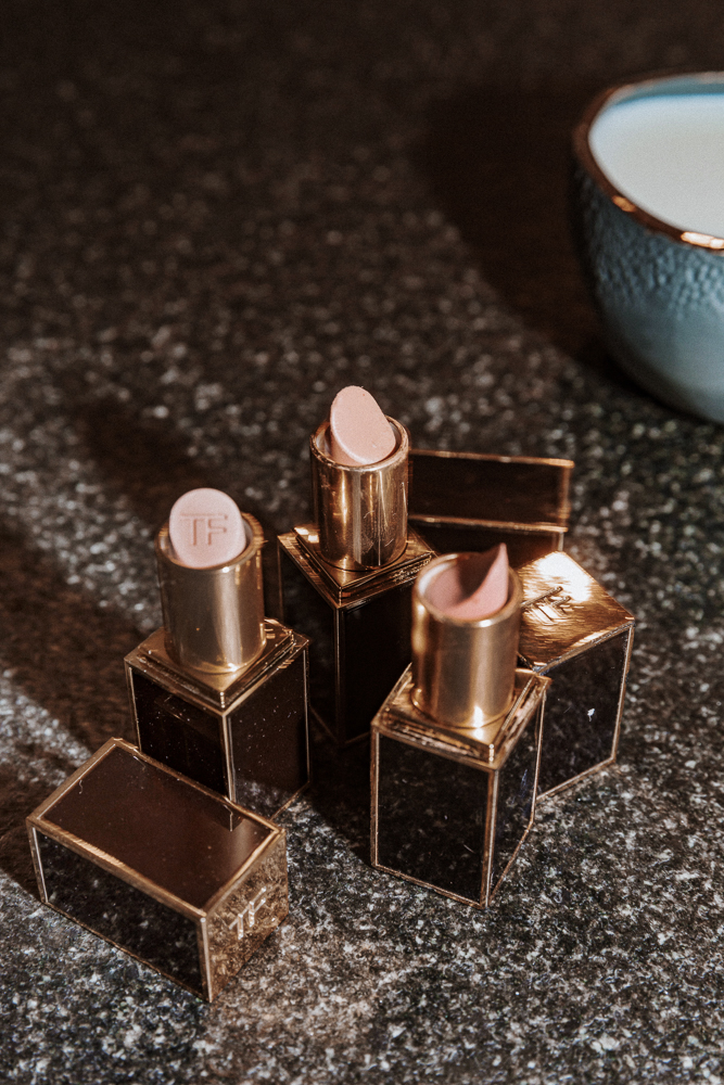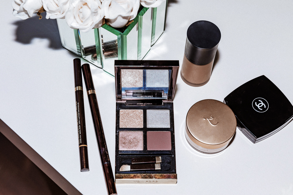 Usually I wear Laura Mercier Tinted Moisturizer in Nude. I love Laura Mercier for skin, but Make Up For Ever makes great foundations for nighttime as well. I use Charlotte Tilbury's Filmstar Bronze and Glow palette all the time. She makes my favorite nude lipstick, I literally use it every day, called Hepburn Honey. And her nude Lip Cheat Pencil, ugh. It's so natural and so pretty. The Tom Ford minis are great for the girls who are deciding whether to take the phone or the lipstick. That's so funny to me. I wear Sable Smoke.