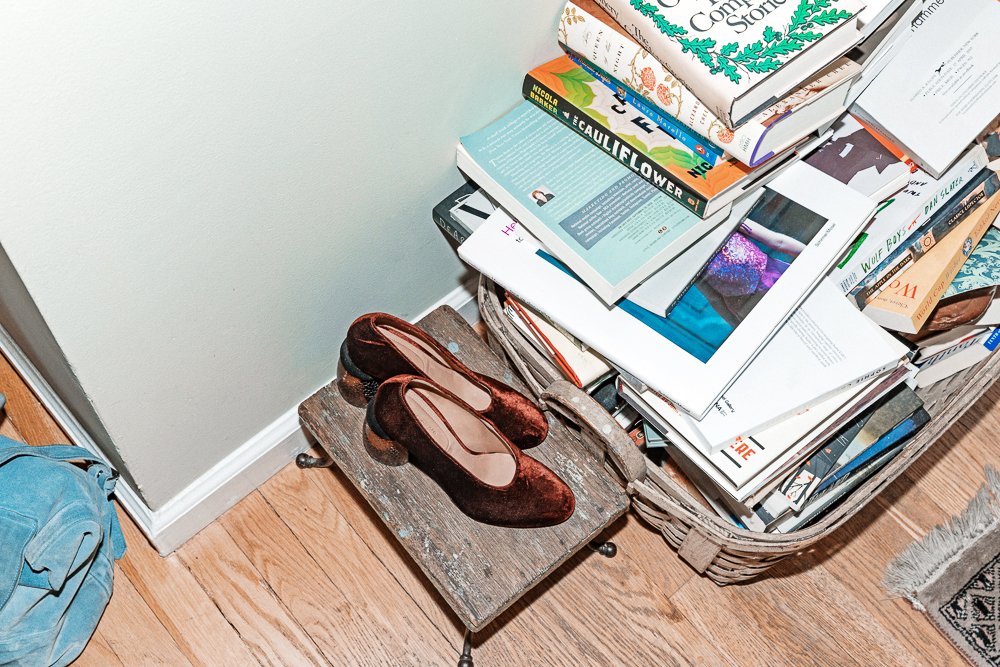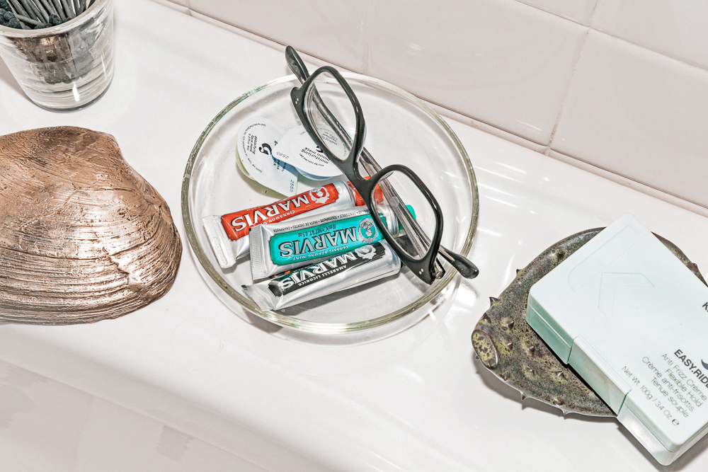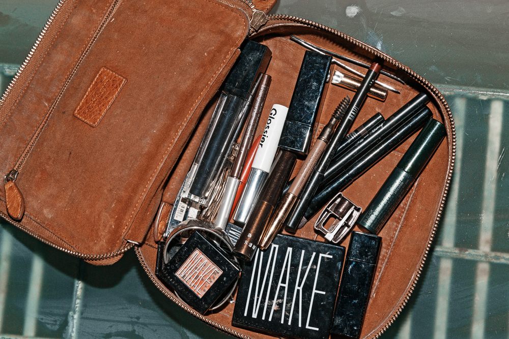 I like to do a blush, and my favorite is Chacha Mango Benetint. I’m also a big fan of Make, so I love the Terrazzo Bronzer in Tower Aisle. Recently I also discovered their Terrazzo Eyeshadow—Strawberry Hill is my favorite. I always want to wear eyeshadows, but they often feel too much like they’re wearing me, and this one isn’t like that. The other one I love is Alabaster and I use it like most people would a primer or luminizer—just in the corners of my eyes and on the lids. Then I’ll finish with this Clinique High Impact Mascara. I have sensitive eyes, so I have to be careful what I use on them and that one is good. For brows I have a Lancôme Natural Blonde Eyebrow Pencil and Glossier’s Boy Browin Brown. Those are good without looking like, ‘I’m an eyebrow!’