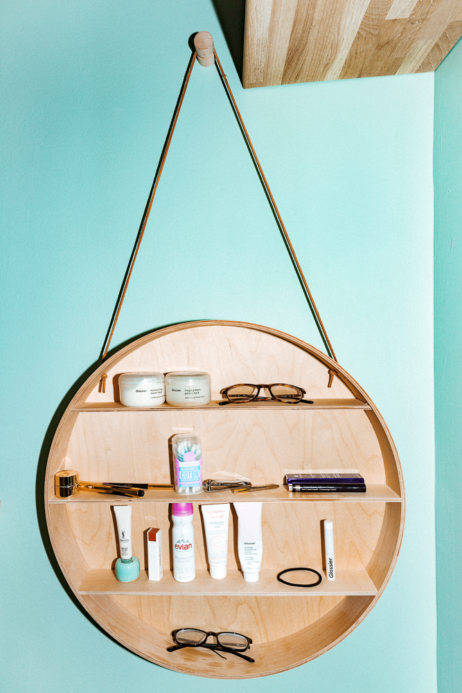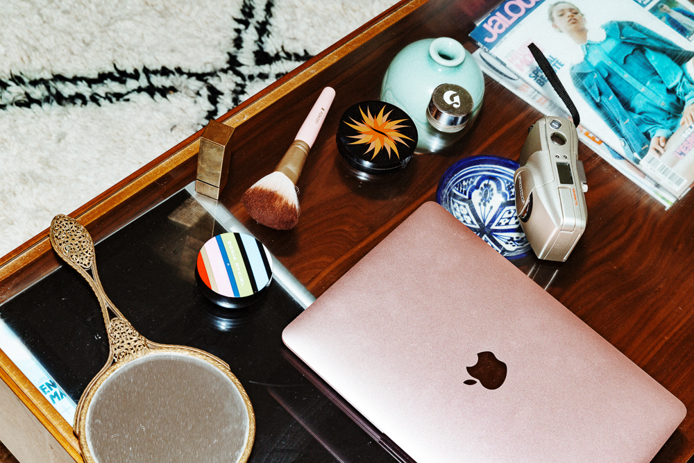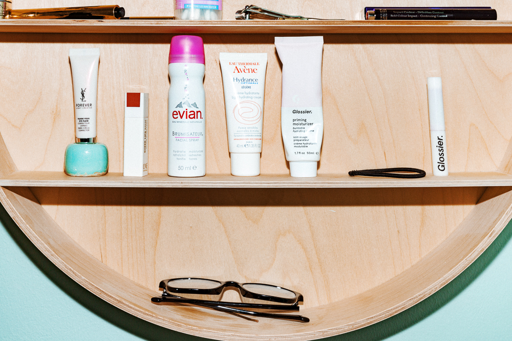 If I don't feel good in an outfit I'll change it several times, but makeup is a little bit easier because it's always the same. I put on Glossier Priming Moisturizer, and then Stretch Concealer after that, especially on my eyelids to cover up the veins. Those aren't pretty. [Laughs] Then some blush, which is Lancôme Sonia Rykiel Splash Coral, followed by Guerlain Terracotta Bronzer. It's completely broken because I dropped it. I put a little on my cheeks and on my nose, but I think it just goes well with my skin coloring.