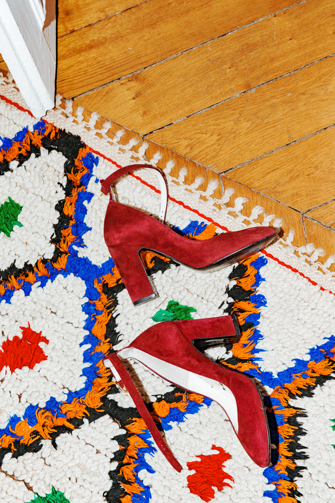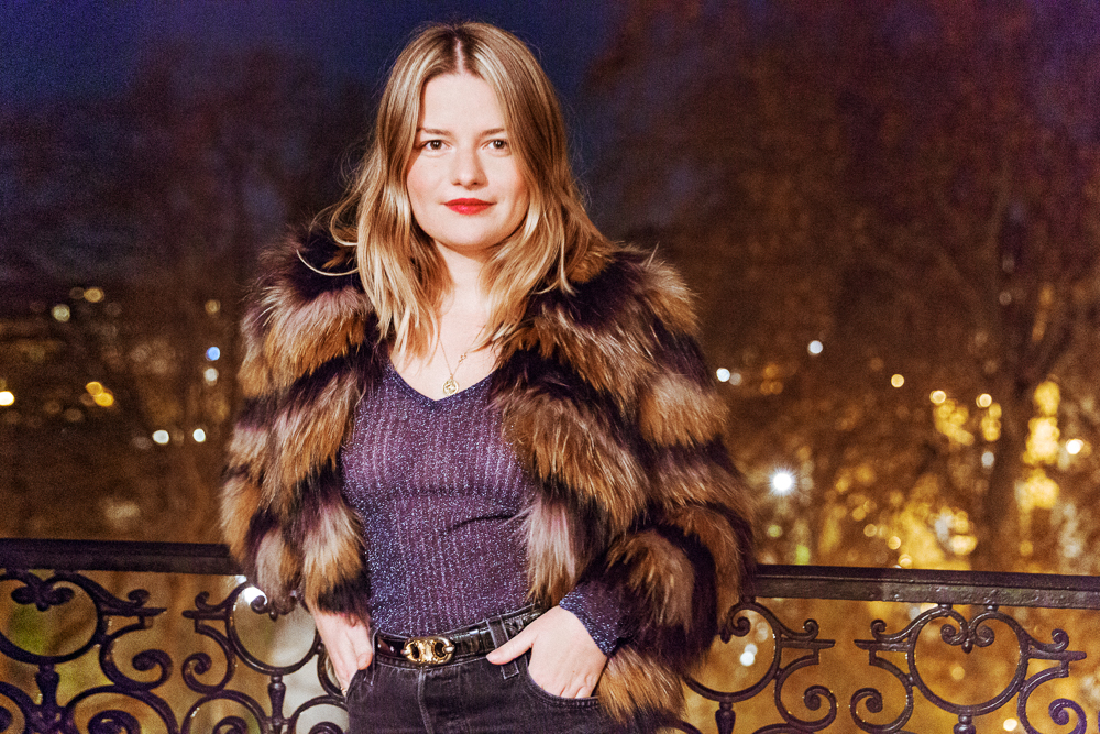 "When I'm getting ready for a party, I'll put on some music, smoke a cigarette, and have a glass of wine—usually white or rosé. It usually takes me about 30 minutes before I leave, but getting dressed takes the longest. French girls, when they dress up, it's maybe a deep V or a bodysuit. Reformation is great, and I love Réalisation Par, too. I love a good glittery top and a heel, obviously. Heels are like a rule. These are by this great brand called By Far, and they're very trendy right now. For accessories, I have my Stone Paris earrings and a tiny purse from Yves Saint Laurent that I use all the time. When I go out, I always have my phone, my cigarettes, my tiny Olympus camera, and my lipstick on me. Tonight I'm wearing YSL Rouge Pur Couture in Rose Crazy.