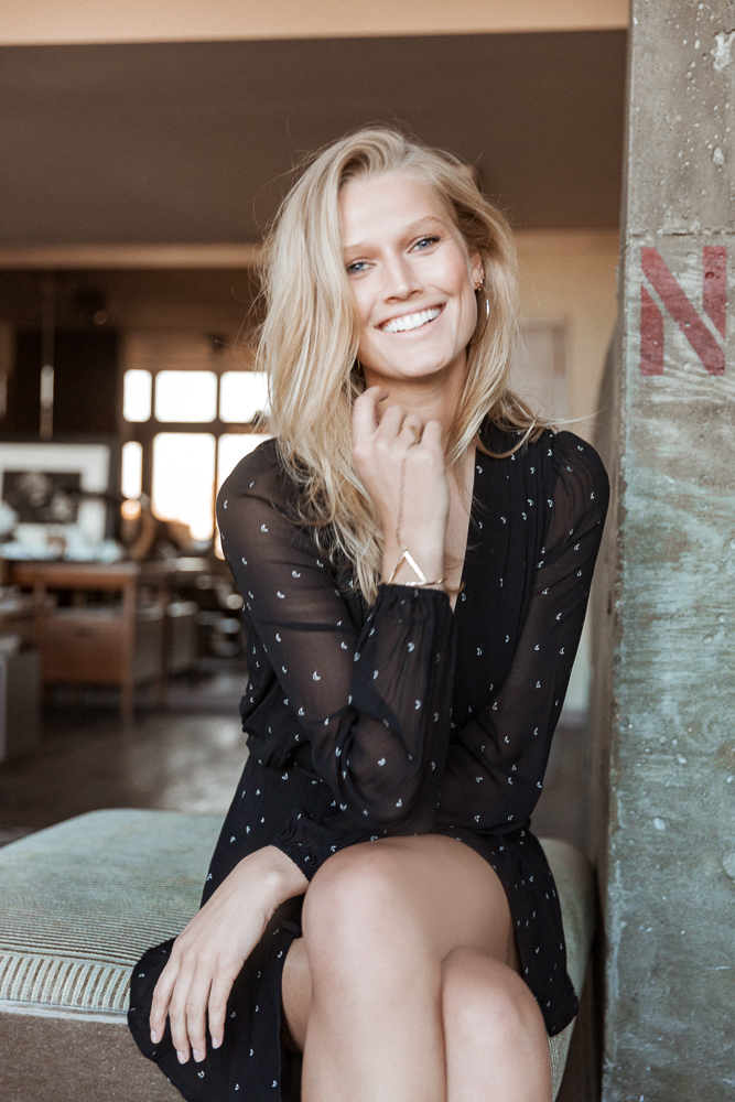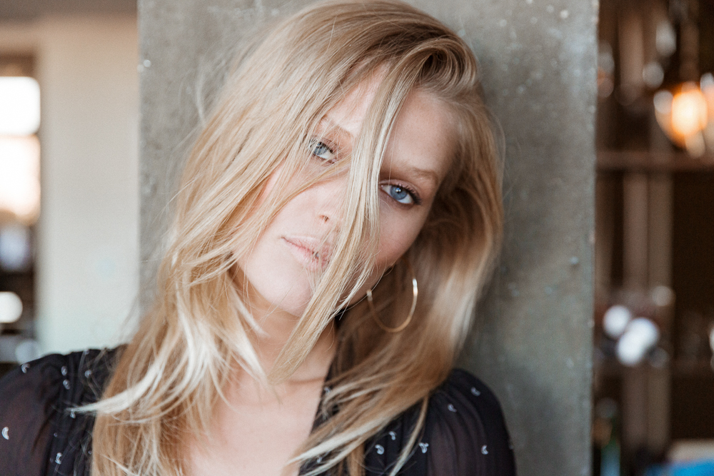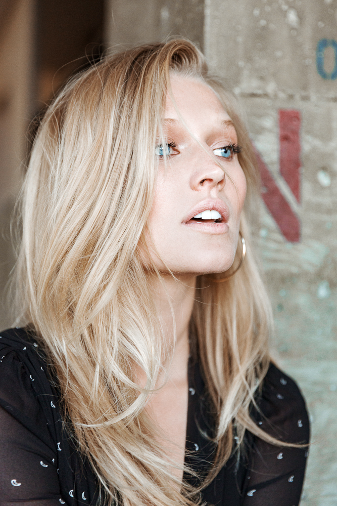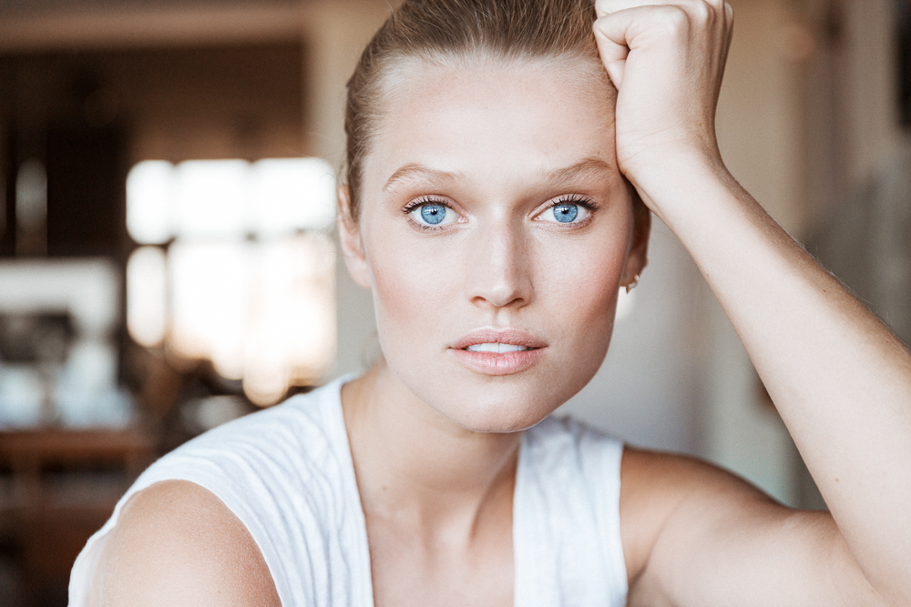 Toni Garrn photographed by Tom Newton. Hair by Braydon Nelson (Julian Watson). Toni is wearing a Reformation dress.