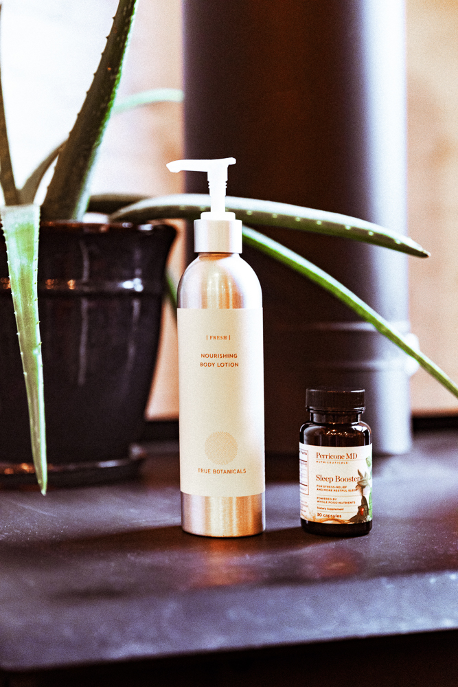 Aha! The crux of it all. Experts say a good night's rest is dependent on adequate wind-down before bed. So what to do? Fans of the nighttime shower might like the True Botanicals Nurturing Body Lotion—it's organic, it smells fresh, it soaks right in, and it's in a recycled pump bottle for lazy application. For a little more zest, try popping one of Perricone MD's new Sleep Booster pills. Don't worry—it's just fancy magnesium and meltonin in a nice bottle. But that certainly doesn't hurt it.
