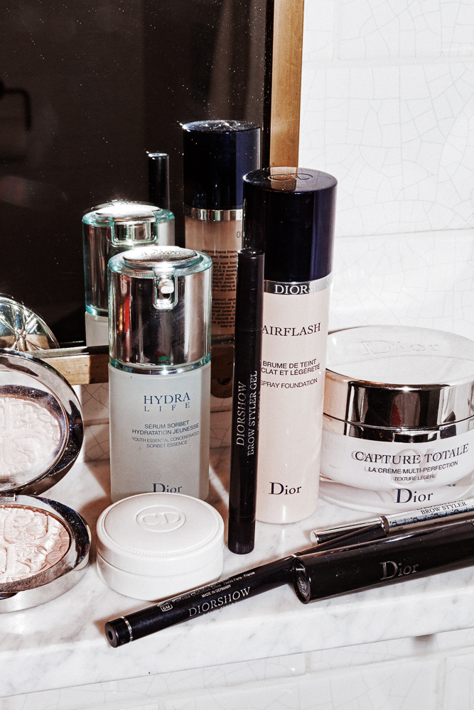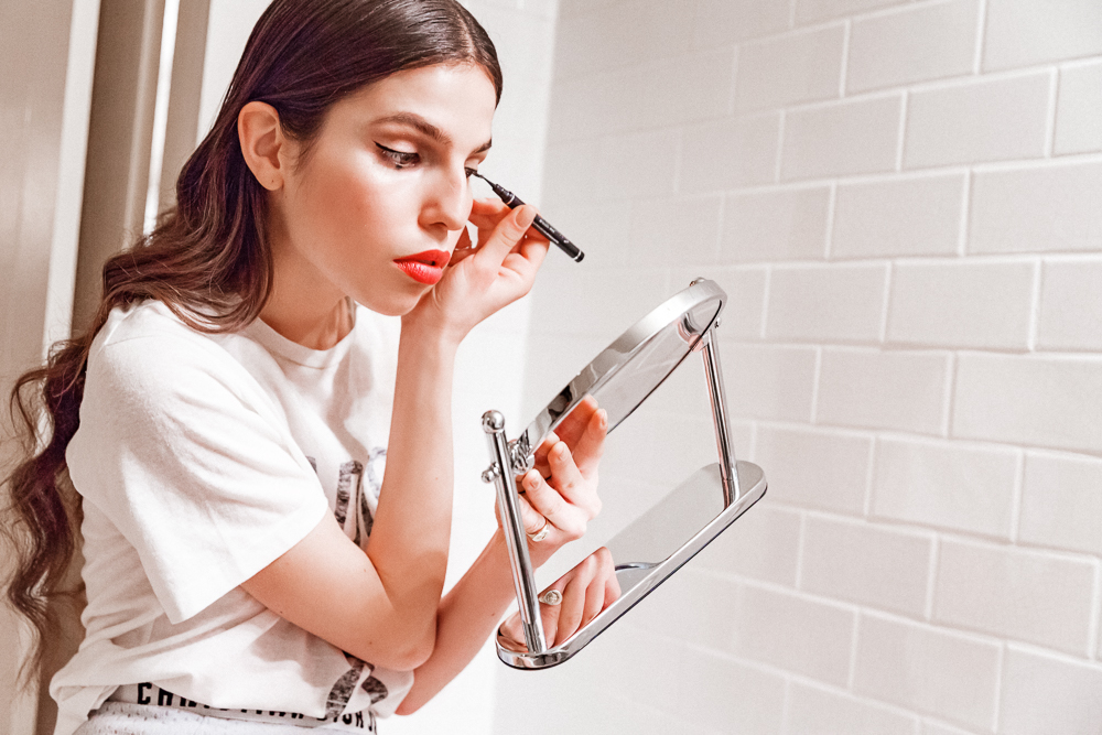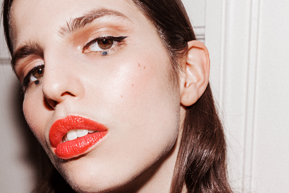 Makeup-wise, I usually do this dot underneath my eye. I just like it, it's very '60s. I was on a Vogue shoot with Pat [McGrath] and Guido, and Pat was like, 'How do you normally do your makeup?' And I showed her the dot, and she's like, 'Why don't we do that?' Pat is amazing, she's so creative but she collaborates. And Steven [Meisel] was great too. He loves to bowl too, he takes Pat and Guido bowling! Anyway, I use a felt-tip eyeliner always—Pat gave me hers, which is great, because it's thin on one end and thick on the other. But it's always a felt tip. The more I think about it, the more I fuck it up. What you have to do is just naturally [flicking noise] and get it over with.