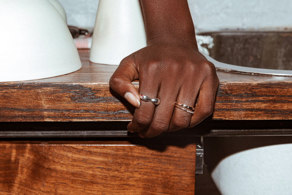 Duckie wears a Raquel Allegra sweater, a vintage t-shirt and rings by Mociun.