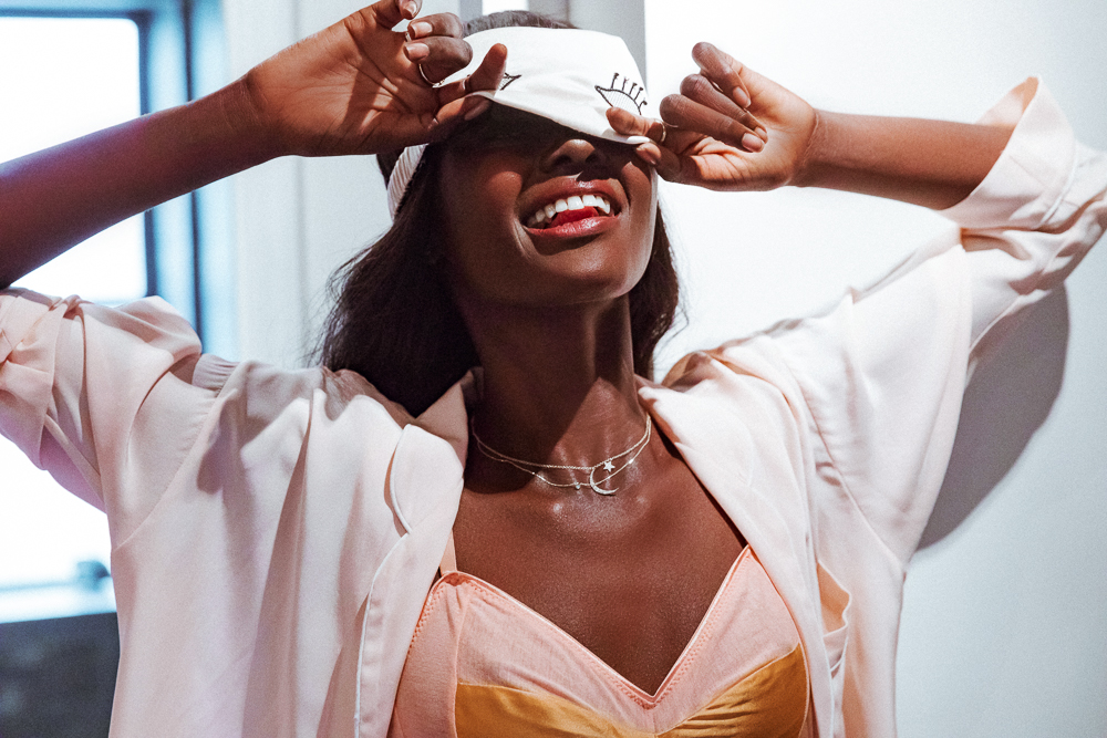 Duckie wears a Morgan Lane x Amanda Fatherazi PJ set over a La Perla bra. She also wears the Meira T Moon & Star Pave Diamond Necklace with Mociun and Brvtvs rings.