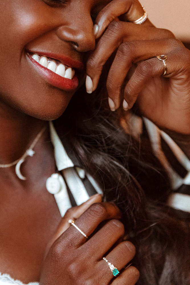 Duckie wears a Sleepy Jones Silk Marina Pajama Shirt paired with an Araks Yanelis Bralette and Brother Vellies Lamu Slides. She also wears the Meira T Moon & Star Pave Diamond Necklace with Mociun rings.
