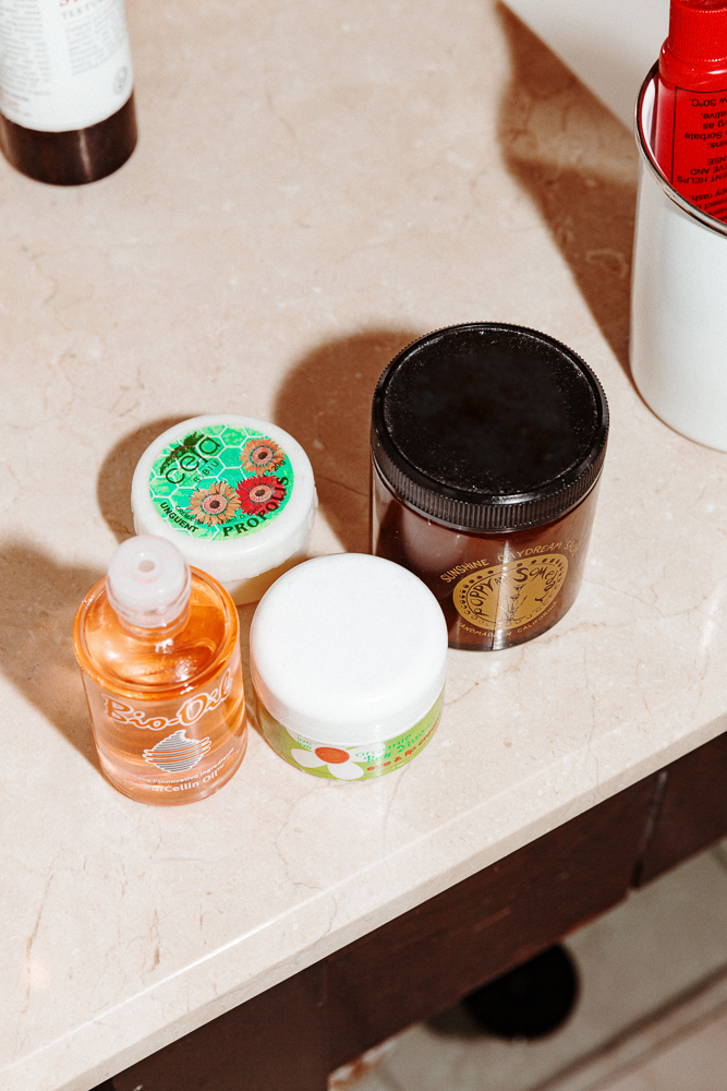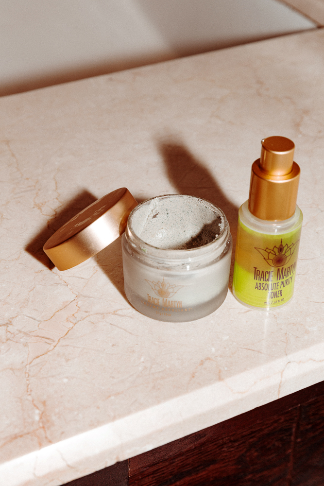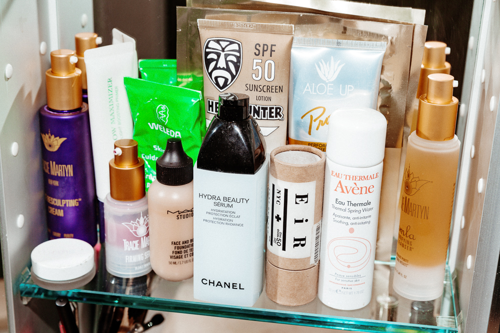 Then I rinse off the mask and put on the Tracie Martyn Resculpting Cream and the Firming Serum around my eyes. If I'm showing skin, I'll moisturize my body. I don't have my oils here, they're in Rockaway. We go there in the summer, and we'll cook and throw dance parties, it's amazing. Tonight I'll just use whatever oil I have, and whatever's left, I'll put on my lips and cheeks.