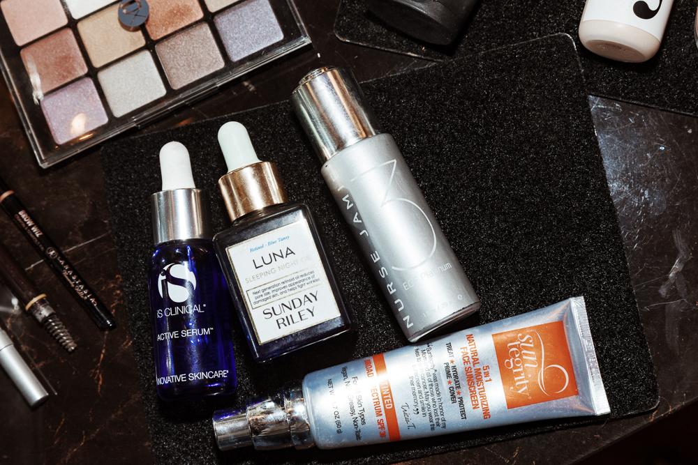 For me, going 'all out' means something super funky or very dressy—not necessarily massive heels or anything, but I love vintage and mixing bizarre prints. My dress tonight is vintage, Austin has incredible vintage shopping. I love makeup, and I'm always excited to do a look, but when you have a job that involves getting made up all of the time, you have to take care of your skin. My main priority is dealing with zits. Before going out, I used to put toothpaste on them, before realizing it made them much, much worse. Luckily, the cameras on Grace and Frankie are very forgiving. I've been using iS Clinical's Active Serum and the Cleansing Complex to zap my zits. I also use the Sunday Riley Artemis Hydroactive Cellular Face Oil. I don't know what it does—like, hydro-actively get in my cells? I'm a gullible consumer. [Laughs] I always do these Skyn Iceland Eye Patches before an event. And after, too. It’s nice to know after a night of drinking I have something to aid in the de-puffing.
