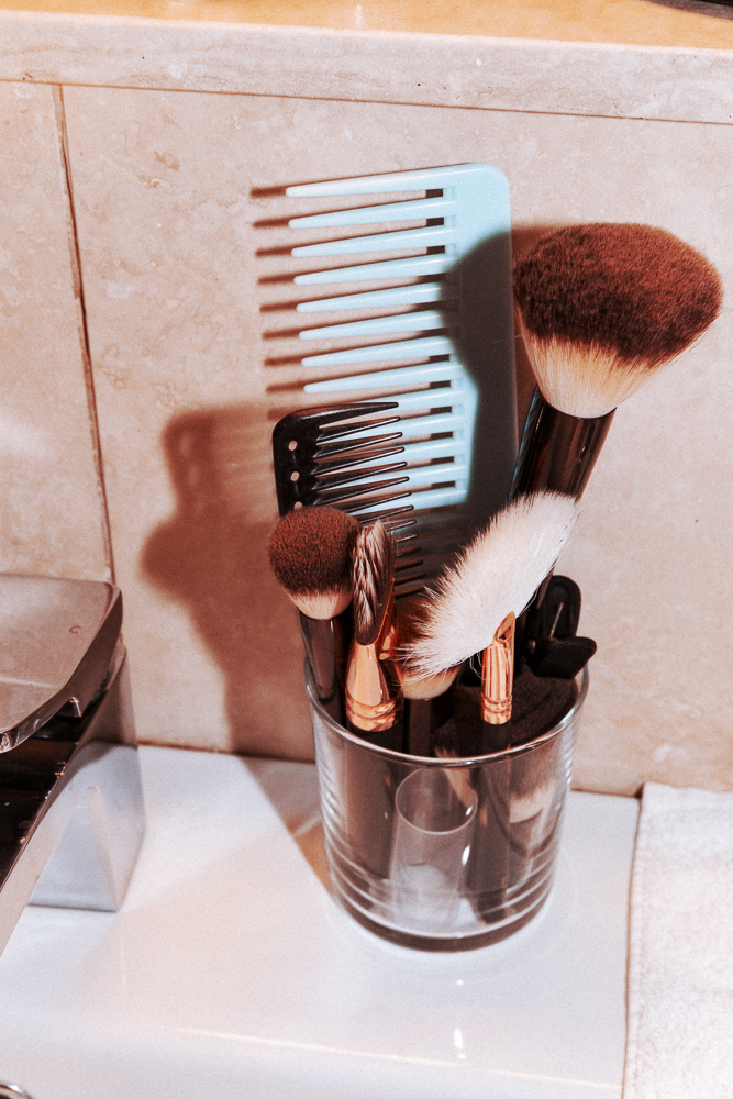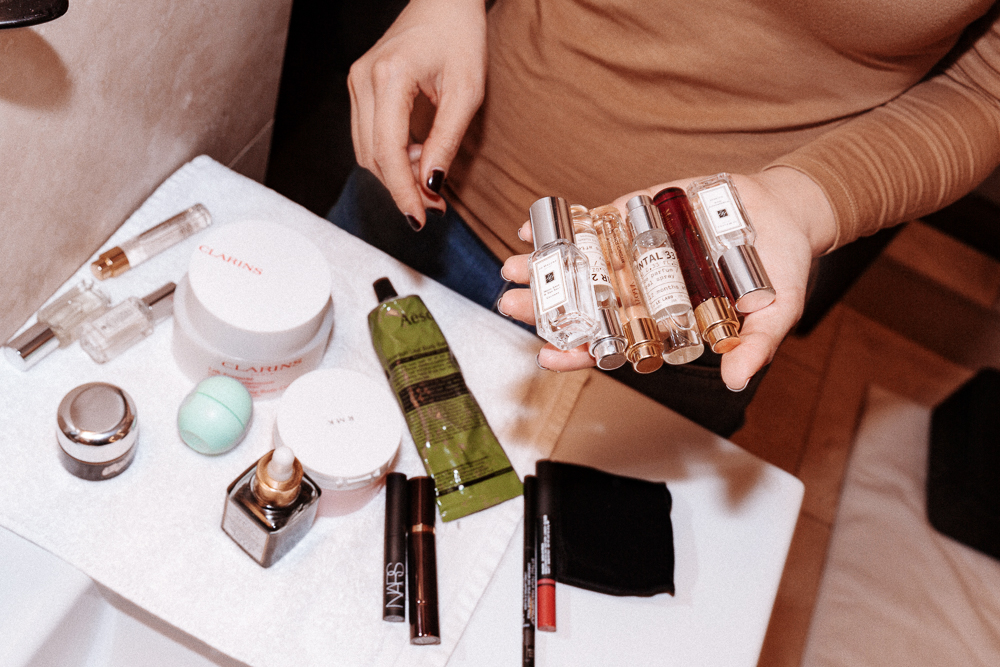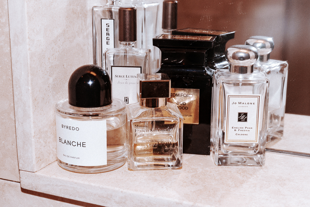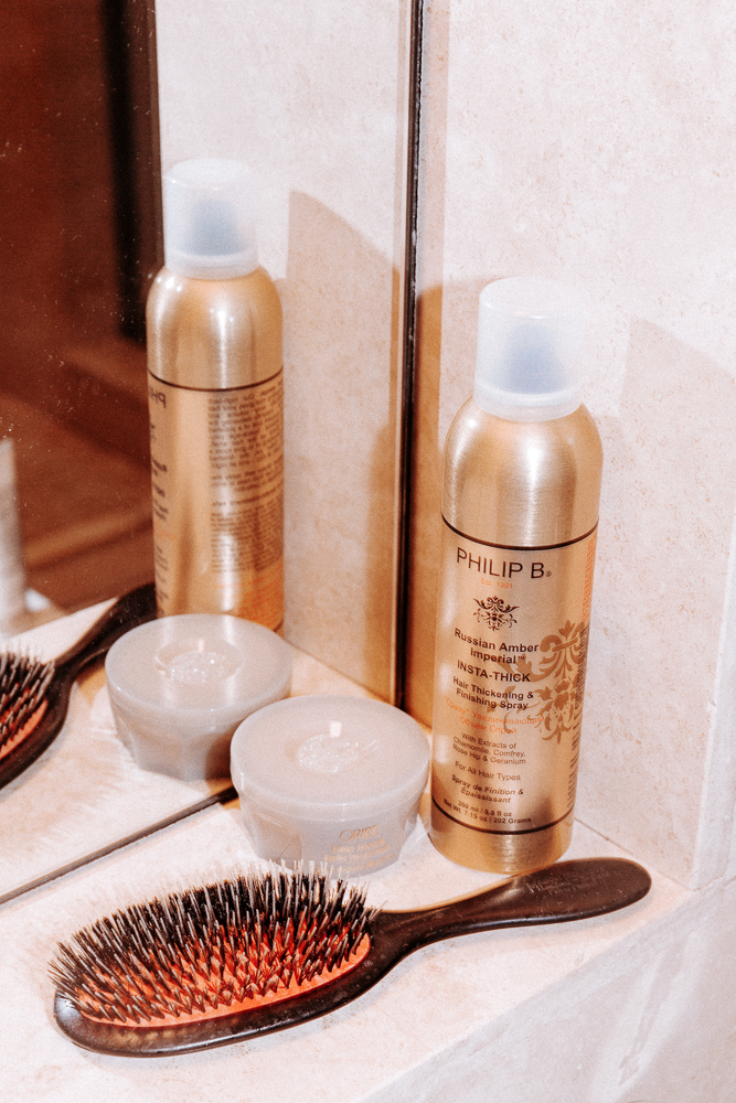 The only hairdresser I trust is Celeste at Symmetria Salon. Only her. When I went to get this cut, I just said, 'Make me look good.' [Laughs] This is my first time having bangs and I am so happy about them. My hair is naturally wavy and crazy, so after I get out of the shower, I air dry and use this Bumble and bumble Dryspun for my texture. Then I’ll use the Oribe Sculpting Cream for more texture, and the Tresemmé Finishing Spray for when I'm done. My fragrance is Maison Francis Kurkdjian Apom. I'll wear that all day and all night. Serge Lutens L'eau de Paille is also great—I wear that when I'm looking for something fresher.