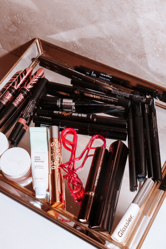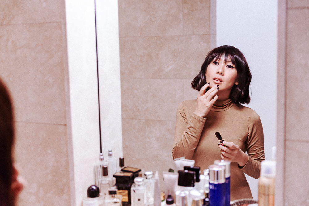 I'm all about highlighting now, but I used to do these green panda eyes—that used to be my look. Now I use much less eyeshadow. Sometimes a makeup artist will use a little brown on my eyelids. You know the Anastasia Contour Kit? It's that brown. The only mascara I use is Lancôme Hypercurl because I find the other ones to be too heavy. Then I have this Korean mascara from Etude House that I use on my lower lash line, drawing tiny dots that from a distance look like lashes. But a cat-eye is me. I feel like I can't leave the house without it. I use the Tom Ford Eye Defining Pen, but only to draw. Then I go back and fill in with the Benefit Push-Up Liner. I swear by it. Everybody complains about it, no one can handle it. But that's a good thing—more for me. [Laughs]