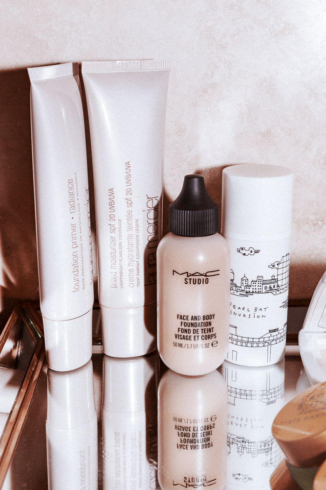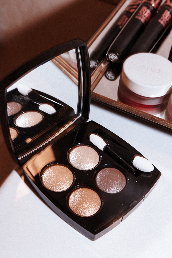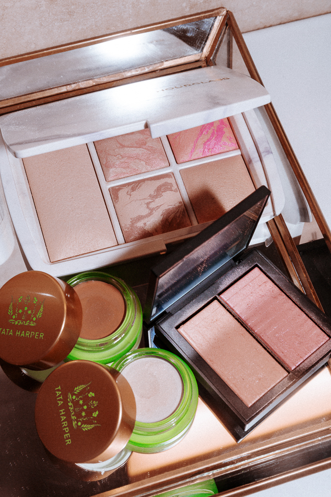 I'm also French—but not in the typical sense. I'm French in the way I leave parties. [Laughs] The ideal night is something much more casual, like chilling with friends. But wherever we're going, I wear makeup. I'm always excited to get ready. You'd be surprised! Sometimes I'll use a primer, but mostly, I'll mix a face oil with Hourglass' Liquid Powder Foundation in Sand or Laura Mercier's Tinted Moisturizer—that's probably my favorite because it's a little sheerer. I love the Nars Sexual...something. I'm blanking on the name, but it's a duo. Sexual Content! It has an orange shade and a pink shade, and I mix them. I just put that on the high points of my face. I'm wearing it now, it's subtle. If I don't do that, the Benefit Dandelion Dew is nice. Or Hourglass' Ambient Lighting is amazing. I like to swipe my brush all over it—I feel like it works with my coloring.