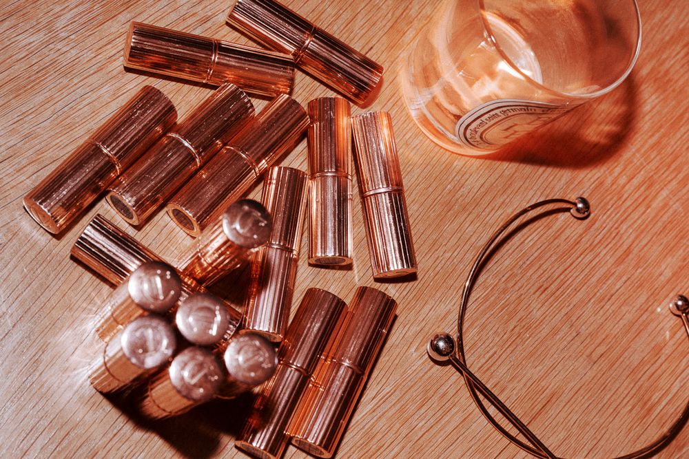 Then I'll use a bit of the Glossier Balm Dotcom before lipstick. I love Charlotte Tilbury for a lip color. Love her! My favorite has got to be Super Cindy—I mean, look at it. It glides, it’s creamy, matte, and it doesn’t dry. I also love So Marilyn if I want a red. That's when I want to look fierce. Tonight I'm wearing Hourglass Influencer. It's a crayon, which makes it pretty easy to use.